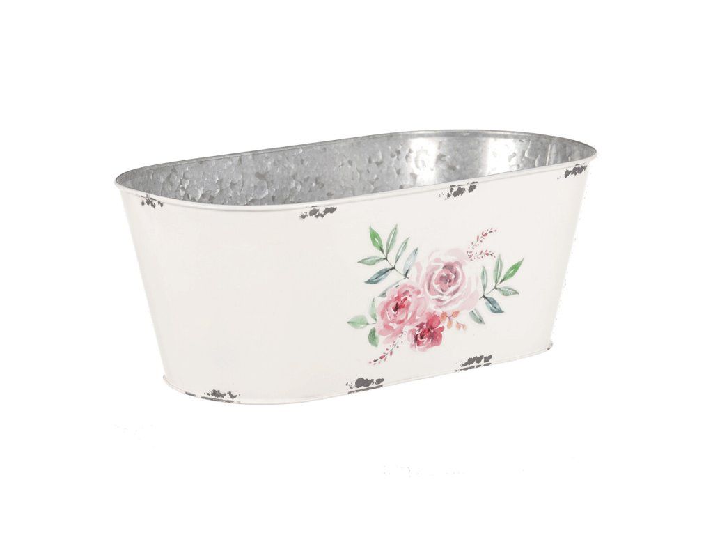 Bílý oválný kovový truhlík s růžemi – elegantní obal na květiny