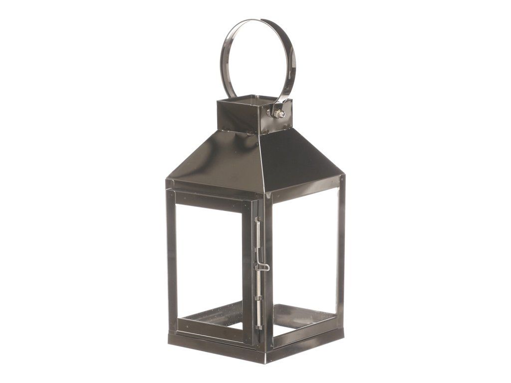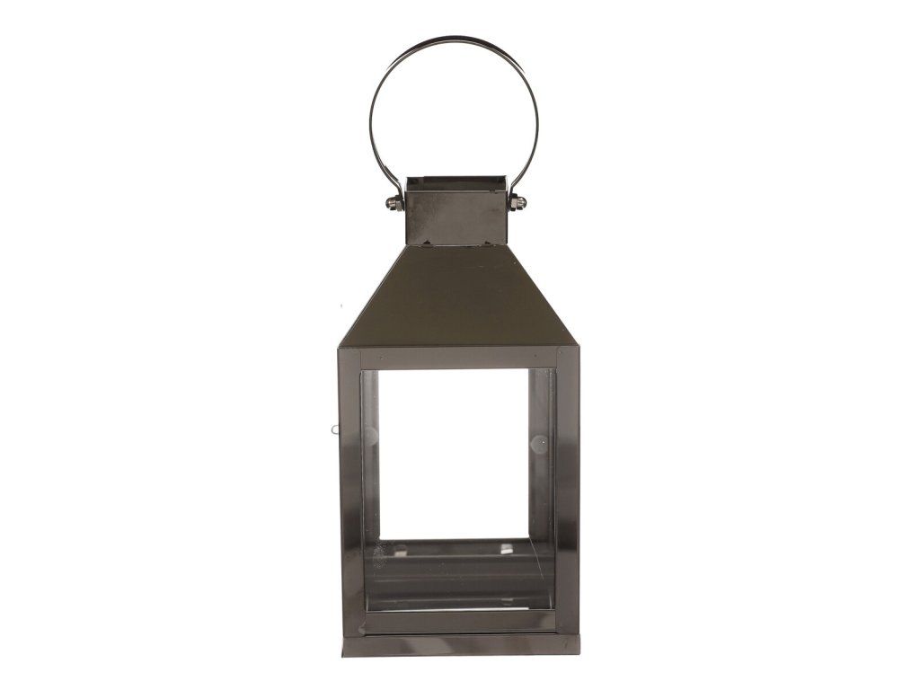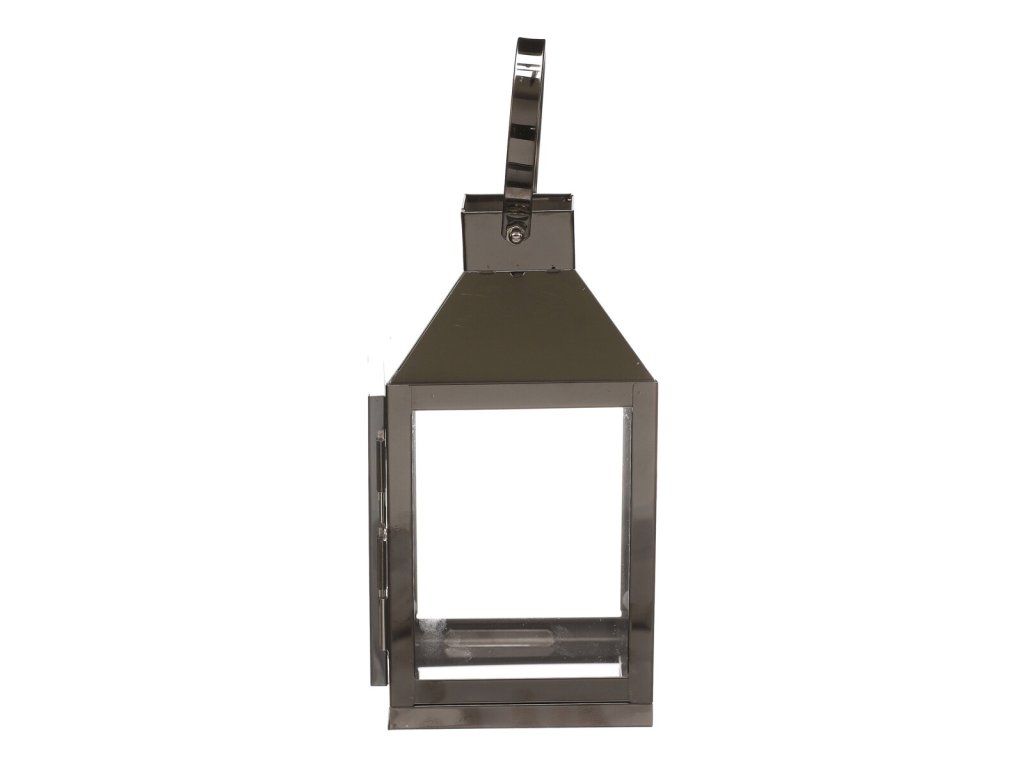 Malá čtyřboká kovová lucerna s černým rámem a skleněnými stěnami je ideální pro vytvoření útulné atmosféry. Lze ji postavit na stůl nebo parapet, nebo pověsit pro originální osvětlení.