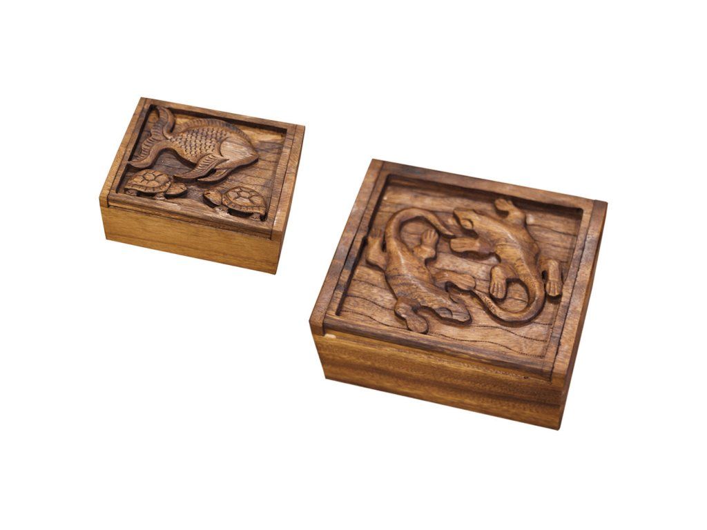 Originální zdobení s exotickými motivy a přírodní mahagonové dřevo dodávají krabičce dekorativní hodnotu. Vynikne v klasickém i moderním prostředí jako stylový detail.