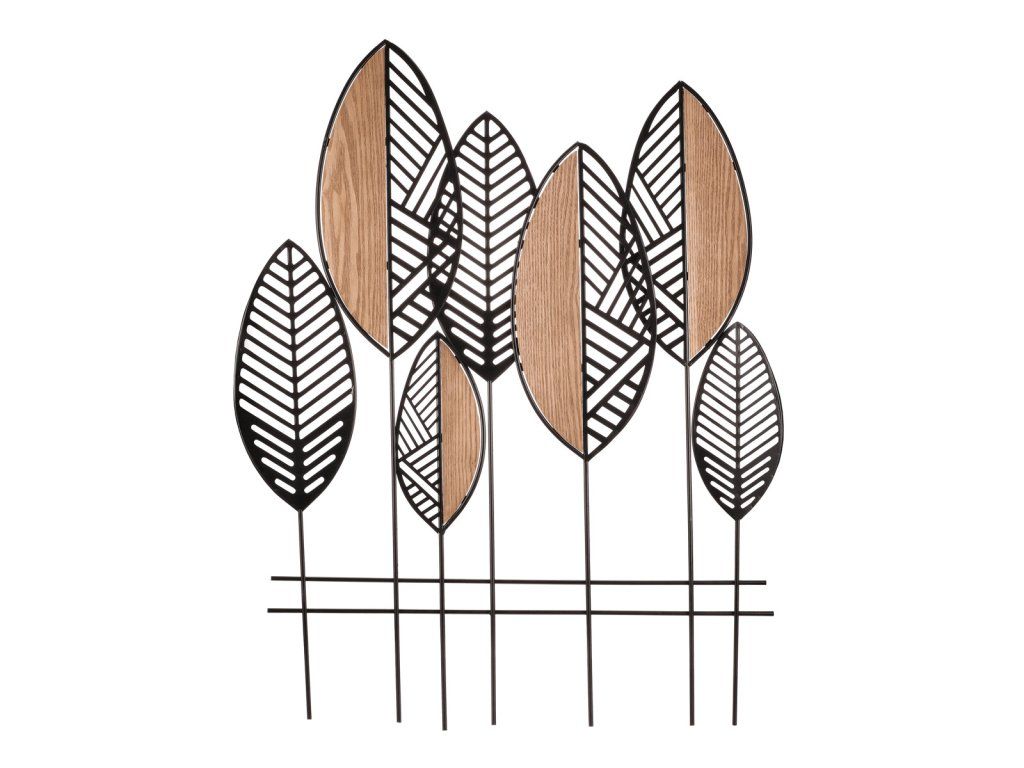 Kovové listy s dřevěnými prvky vytvářejí originální a moderní doplněk do interiéru. Snadno ji připevníte na stěnu a využijete jako výrazný dekorativní prvek v obývacím pokoji, chodbě nebo ložnici.