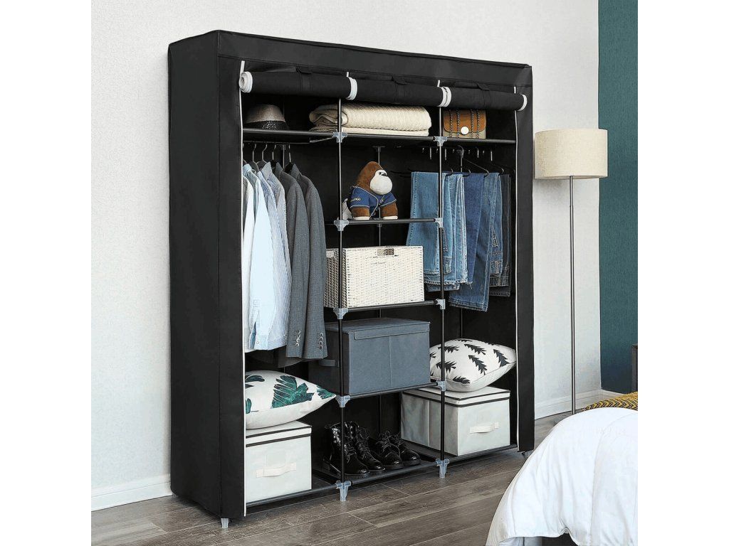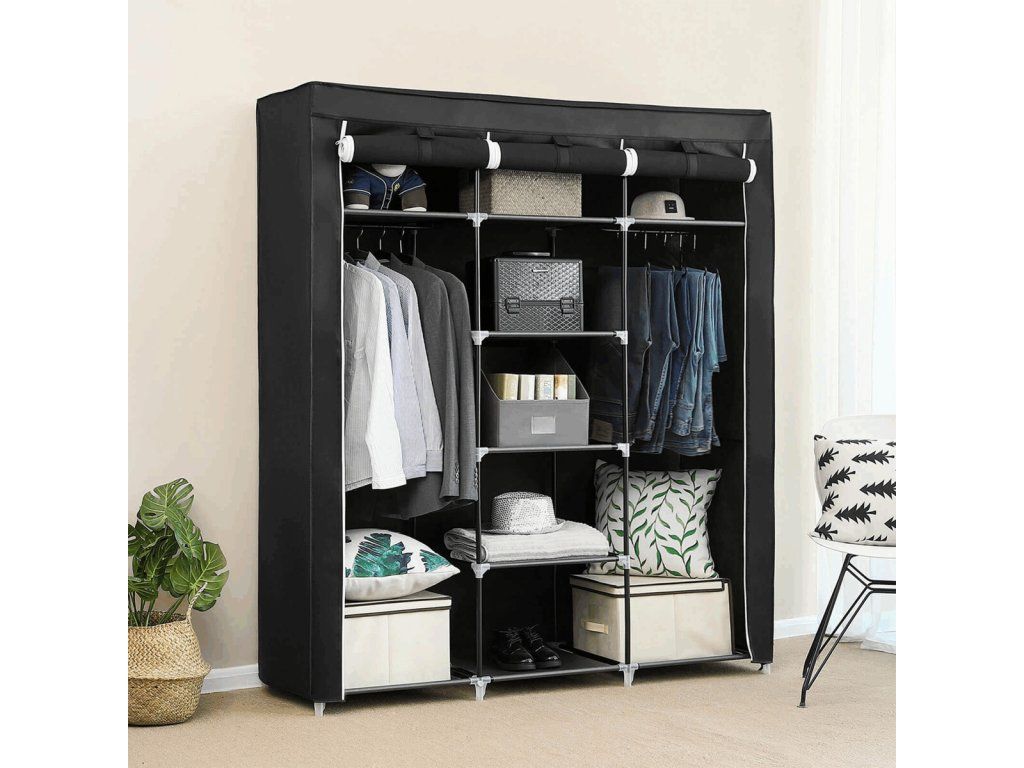 Látková šatní skříň v černém provedení nabízí praktické řešení úložného prostoru pro oděvy a doplňky. Její pevná kovová konstrukce zajišťuje stabilitu a dlouhou životnost, zatímco černá látka chrání obsah před prachem a nečistotami. Skříň je vybavena třemi závěsnými tyčemi pro zavěšení oblečení a třemi policemi uprostřed pro uložení složených věcí nebo krabic. Přední část lze jednoduše stáhnout pomocí rolovacích pásků, což umožňuje rychlý přístup k obsahu. Díky kompaktním rozměrům a lehké konstrukci je vhodná do menších prostor i jako doplňkový úložný systém.