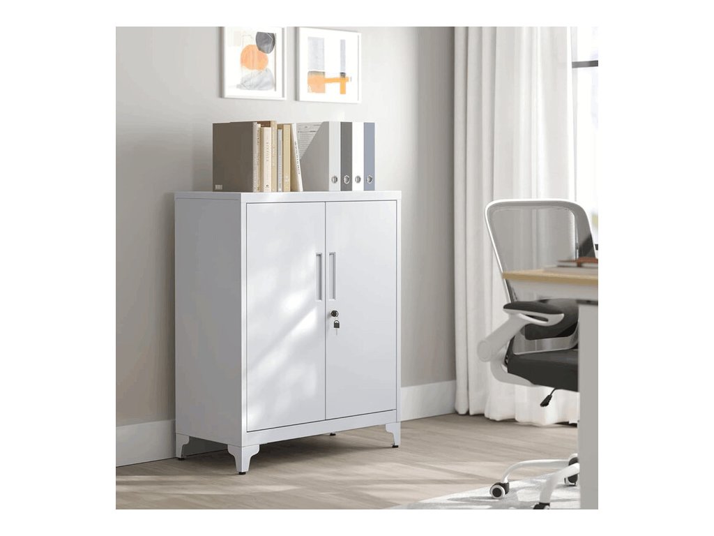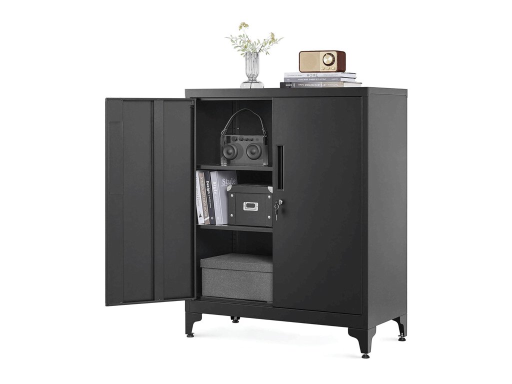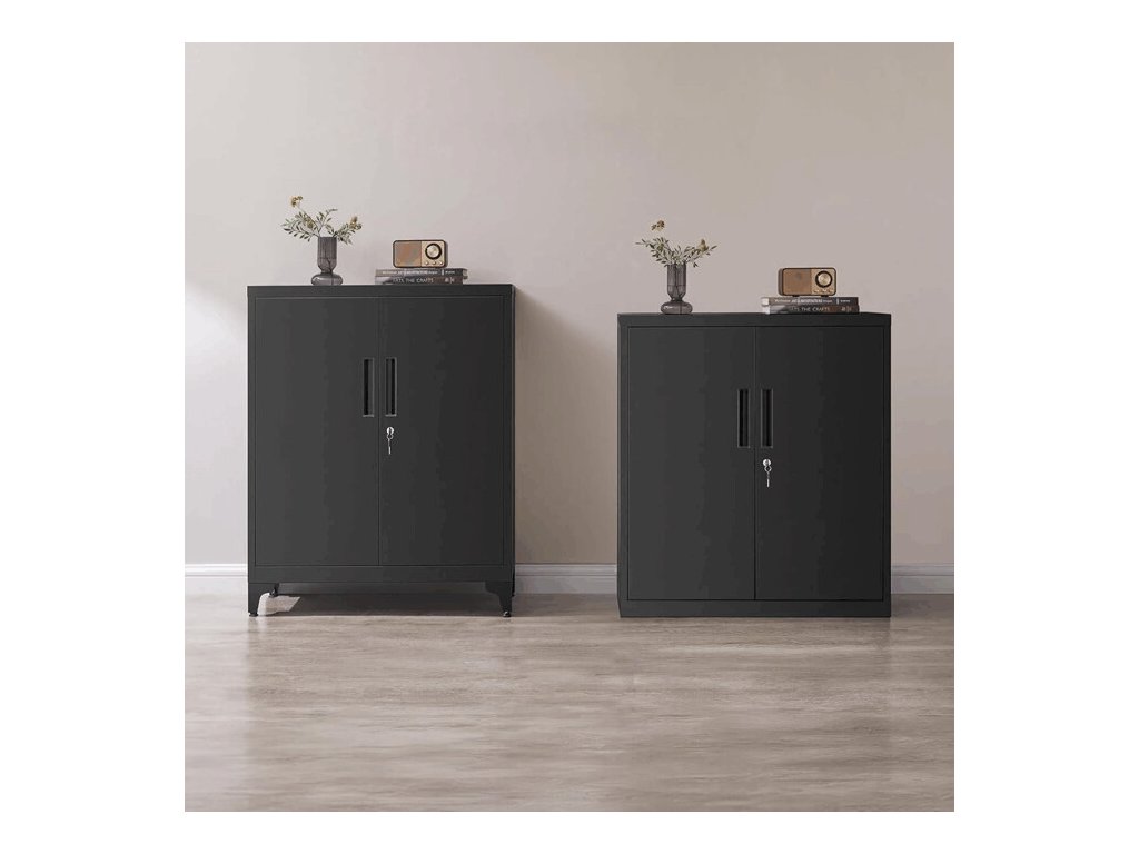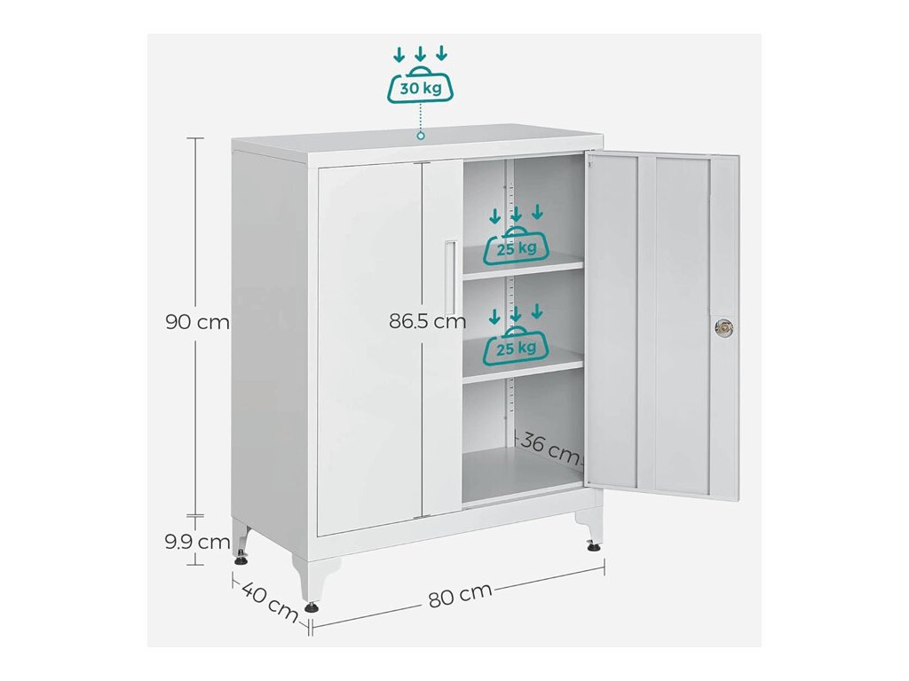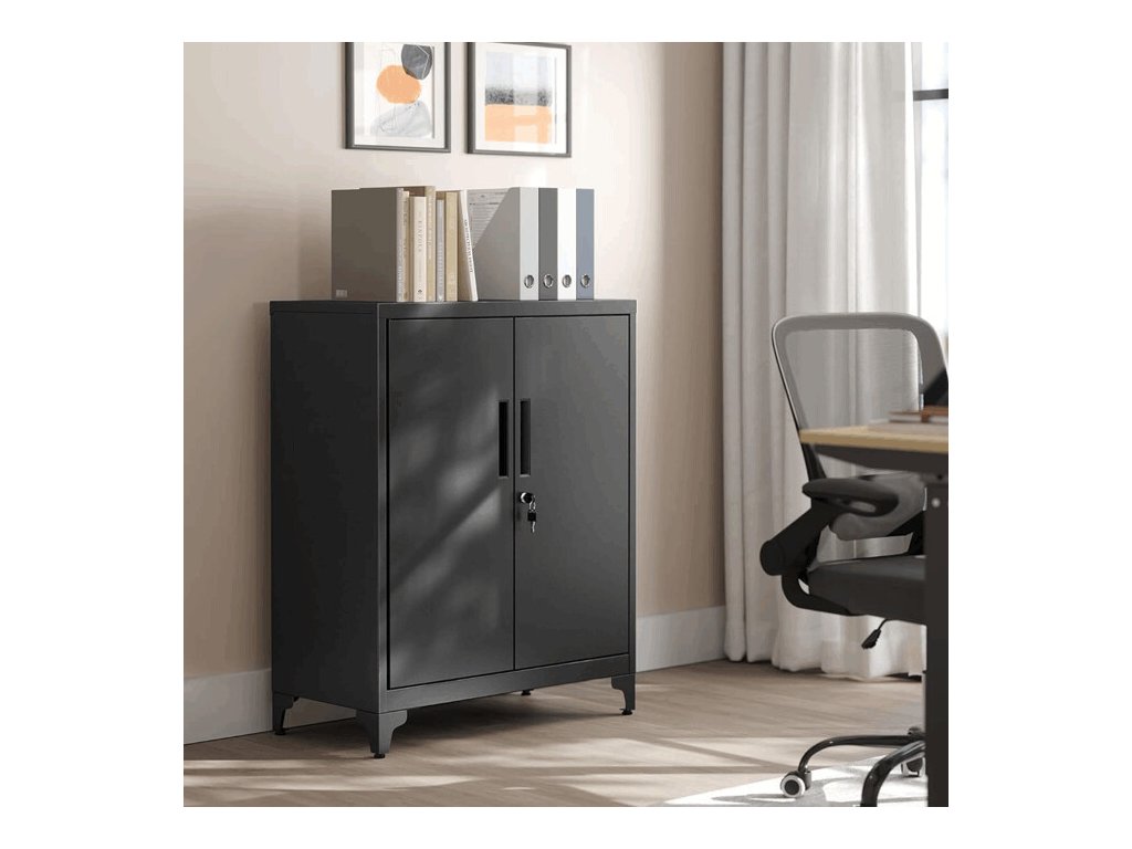 Úložná skříňka Autronic v černém provedení je vyrobena z pevného kovu s práškovou povrchovou úpravou, která zajišťuje odolnost proti poškození a snadnou údržbu. Nabízí tři vnitřní police, které poskytují dostatek prostoru pro organizaci dokumentů, kancelářských potřeb nebo drobných předmětů. Dveře jsou vybaveny praktickým zamykacím mechanismem pro bezpečné uložení obsahu. Stabilní kovové nohy s nastavitelnými patkami umožňují vyrovnání na nerovném povrchu a zvyšují celkovou stabilitu skříňky. Rozměry 80 x 40 x 100 cm ji předurčují pro využití v kancelářích i domácnostech, kde je potřeba efektivní a bezpečné úložiště.