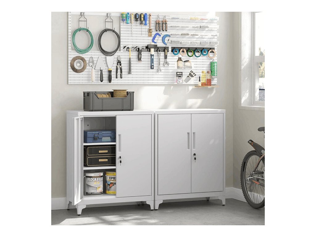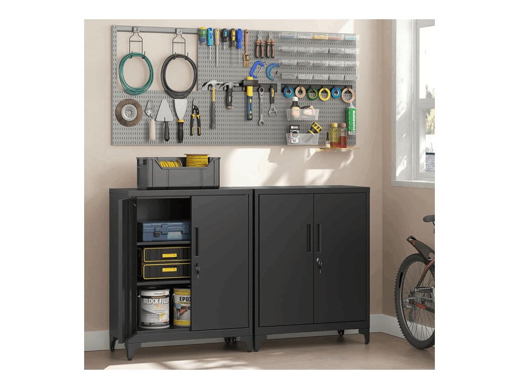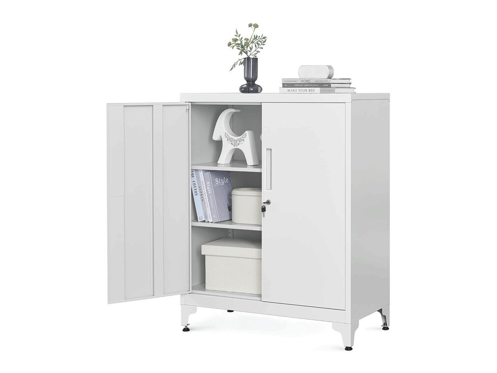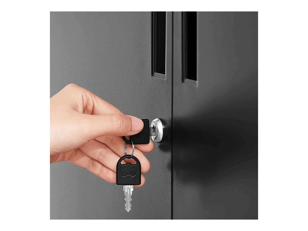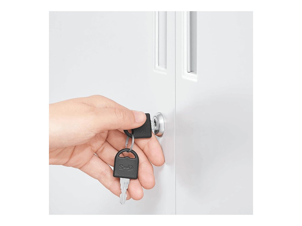 Úložná skříňka Autronic v černém provedení je vyrobena z pevného kovu s práškovou povrchovou úpravou, která zajišťuje odolnost proti poškození a snadnou údržbu. Nabízí tři vnitřní police, které poskytují dostatek prostoru pro organizaci dokumentů, kancelářských potřeb nebo drobných předmětů. Dveře jsou vybaveny praktickým zamykacím mechanismem pro bezpečné uložení obsahu. Stabilní kovové nohy s nastavitelnými patkami umožňují vyrovnání na nerovném povrchu a zvyšují celkovou stabilitu skříňky. Rozměry 80 x 40 x 100 cm ji předurčují pro využití v kancelářích i domácnostech, kde je potřeba efektivní a bezpečné úložiště.