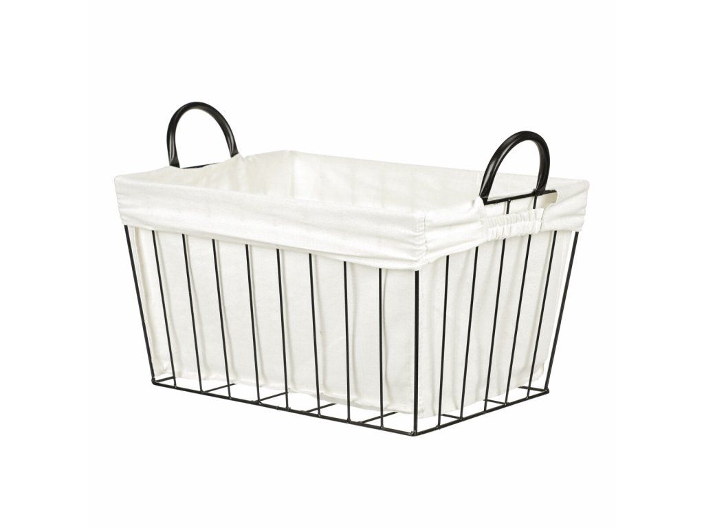 Kovový koš s látkou slouží k ukládání prádla, hraček nebo drobných předmětů. Díky pevné konstrukci a látkovému vnitřku udrží pořádek a zabrání propadání menších věcí.