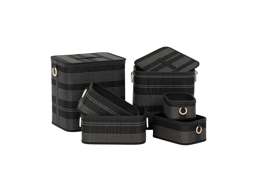 Sada šesti stylových košů v černo-bílém provedení s bambusovým povrchem spojuje praktičnost s elegantním vzhledem. Dva největší slouží jako prádelní koše s víkem, menší jsou ideální do regálů nebo polic. Díky různým velikostem nabízí variabilní možnosti pro ukládání prádla, oblečení i drobností. Skvěle poslouží doma i na chalupě, přičemž snadněji udrží prostory uspořádané a čisté.