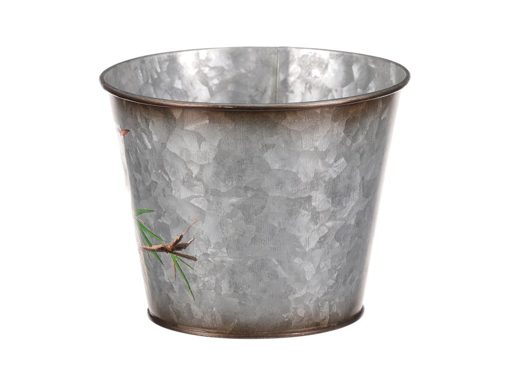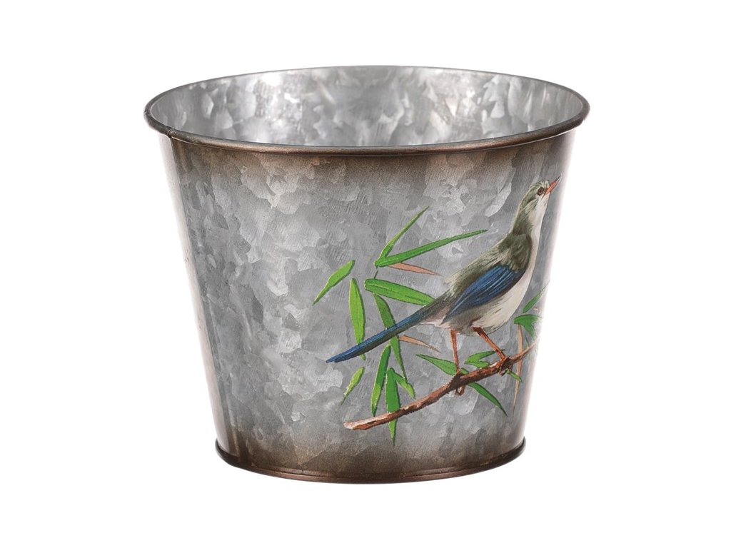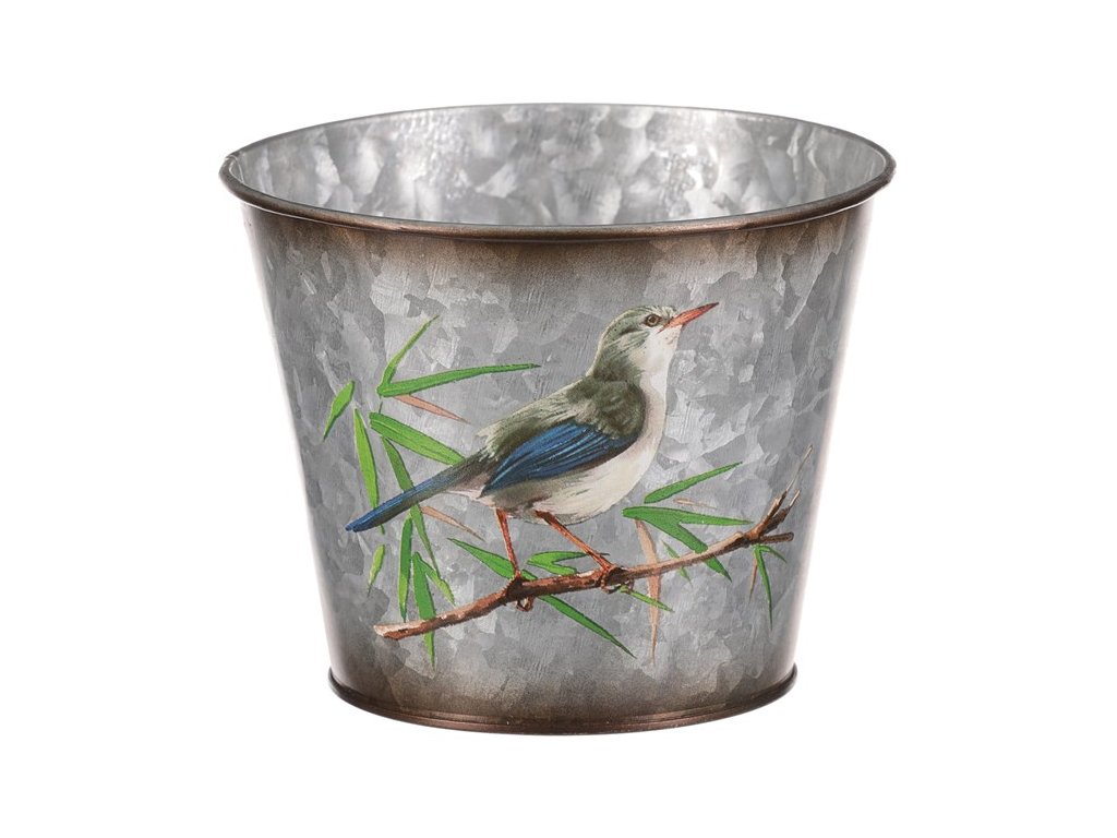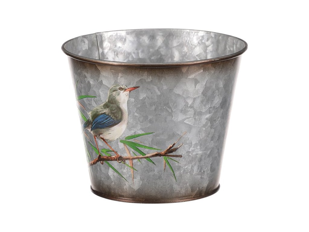 Kovový obal na květiny, design s ptáčky.