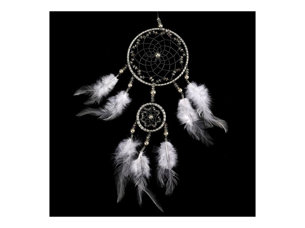 Bílý lapač snů z peří a kovu slouží k dekoraci interiéru a ochraně před nočními můrami. Vhodný do ložnice, obývacího pokoje nebo chodby.
