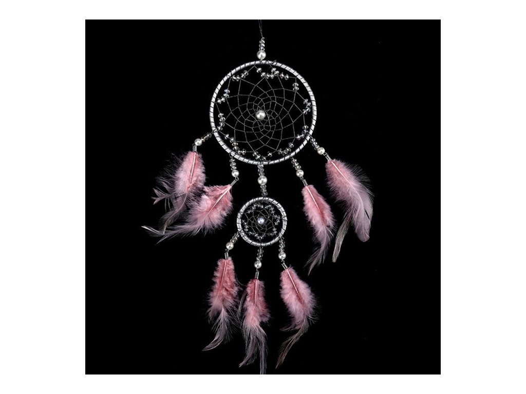 Lapač snů z peří v růžové barvě je ideální pro zavěšení na okno nebo stěnu. Přináší klid a harmonii do vašeho domova či kanceláře.