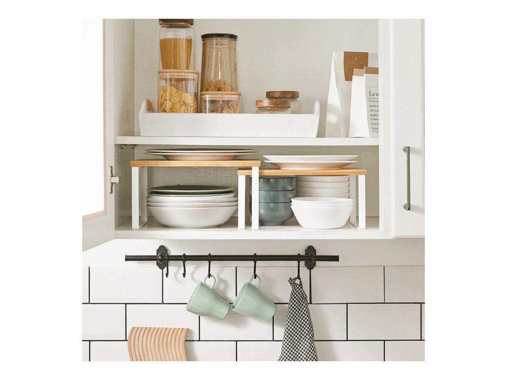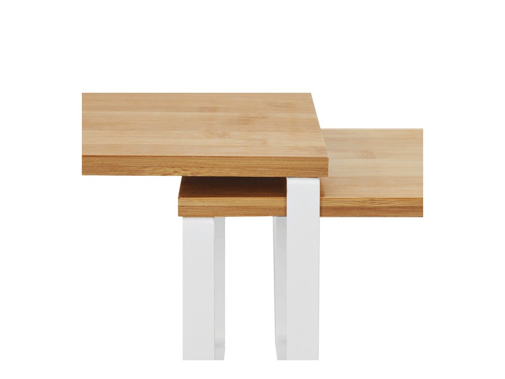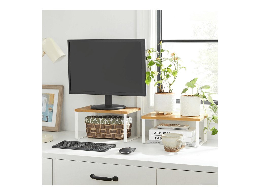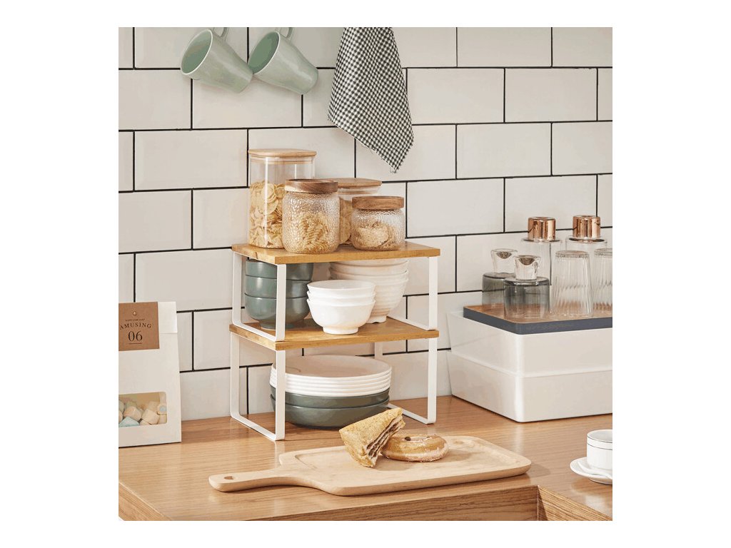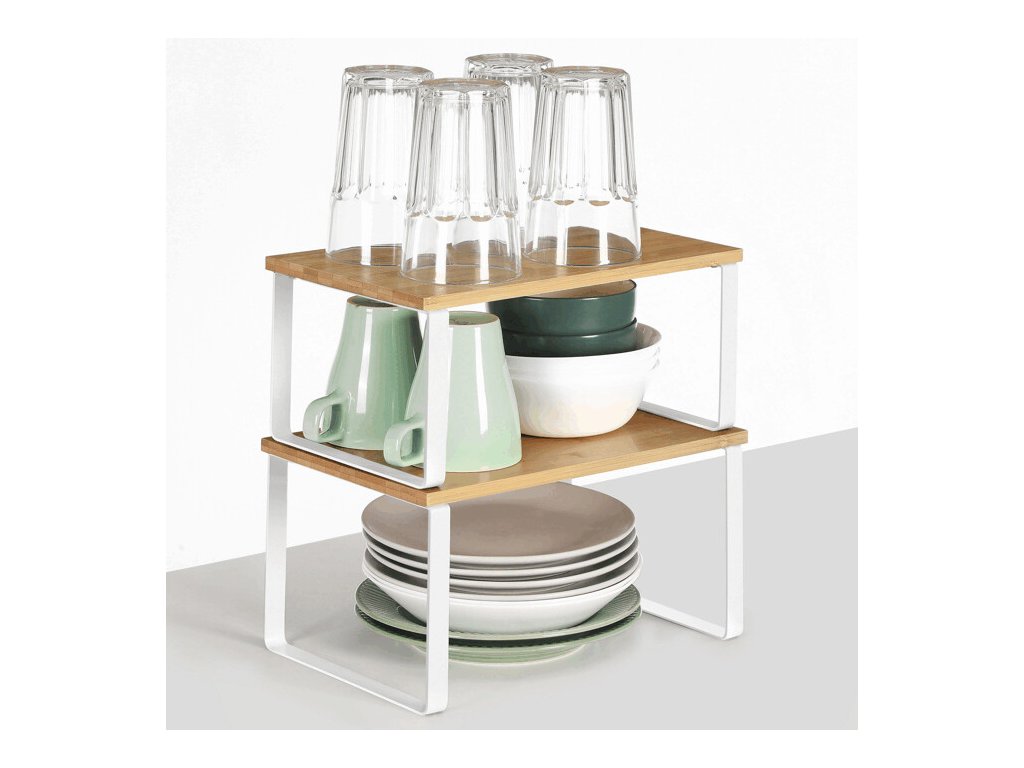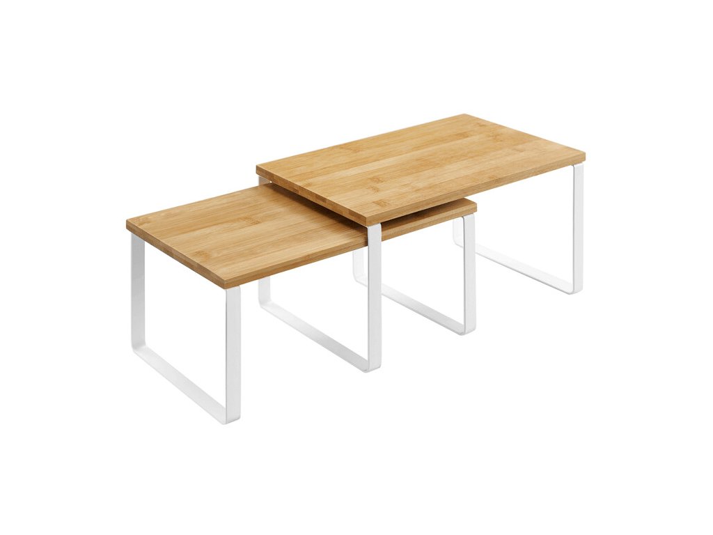 Set kuchyňských poliček kombinuje přírodní bambusové desky s bílým kovovým rámem, který zajišťuje stabilitu a moderní vzhled. Poličky nabízejí dva odkládací prostory vhodné pro uspořádání kuchyňských potřeb, koření nebo dekorací. Bambusové desky jsou hladké a snadno se udržují, což přispívá k dlouhé životnosti produktu. Kompaktní rozměry umožňují umístění na pracovní desku nebo do menších prostor. Celkový design je minimalistický a funkční, ideální do moderních i přírodně laděných interiérů.