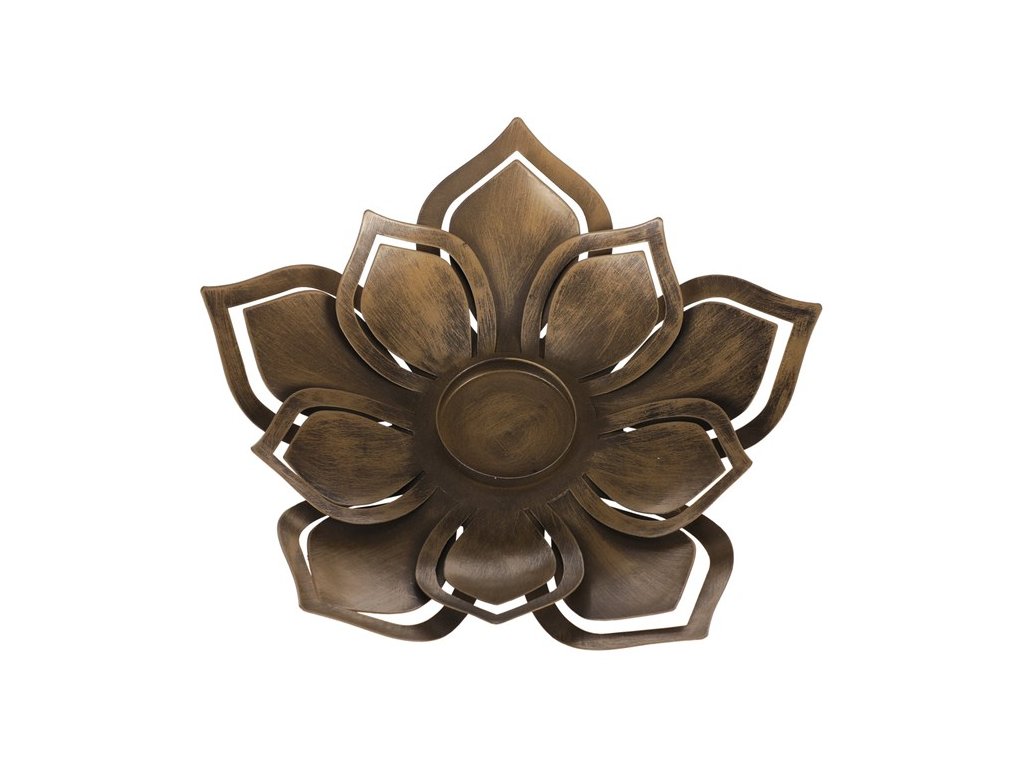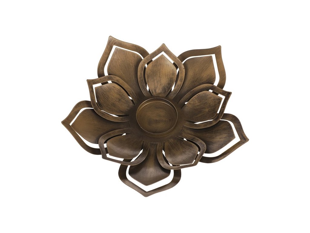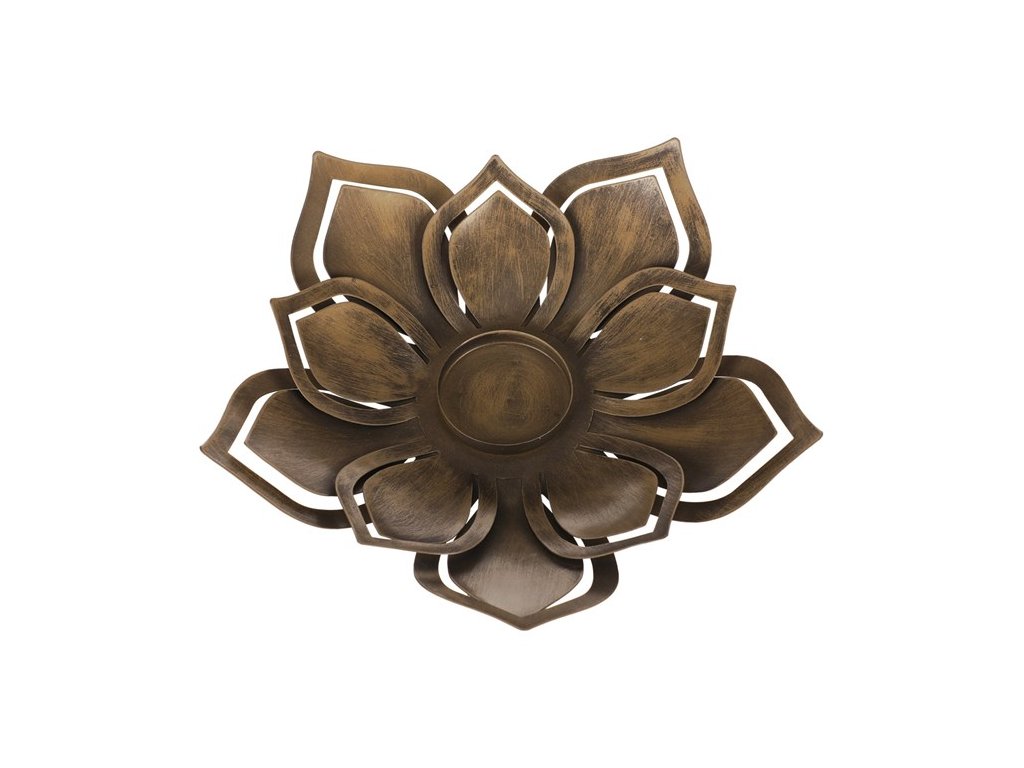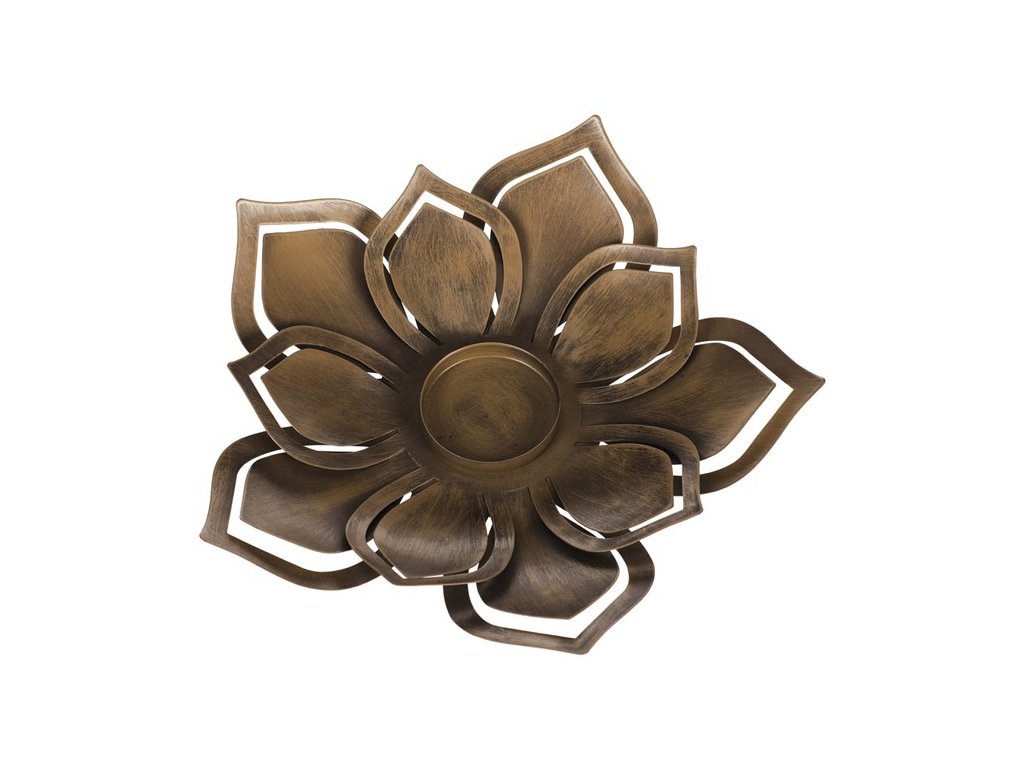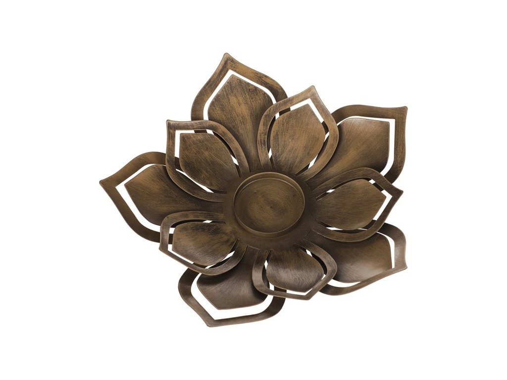Kovový svícen ve tvaru květu s rezavým vzhledem je ideální pro vytvoření útulné atmosféry. Vhodný pro různé typy svíček, například čajové nebo stolní.