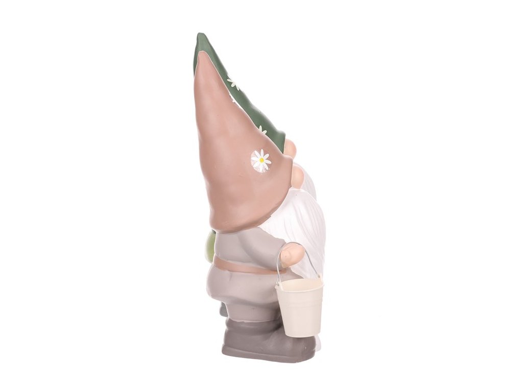 Postavička má zakrytý obličej, špičatou čepici a bambulatý nos s bílými vousy. Drží kbelík, připravený na práci na zahradě.
