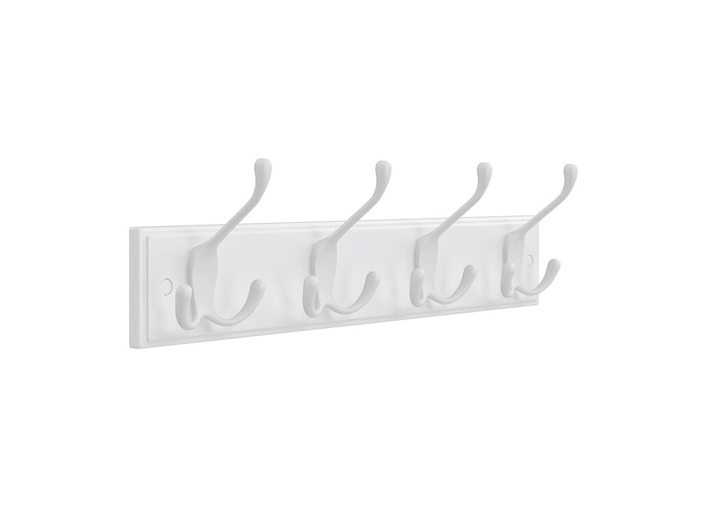Nástěnný věšák v bílém provedení nabízí čtyři pevné háčky pro praktické zavěšení oděvů či doplňků. Vyroben je z kvalitního dřeva s hladkým povrchem a nadčasovým designem, který snadno zapadne do různých interiérů. Kompaktní rozměry umožňují jeho umístění v předsíních, chodbách nebo ložnicích. Věšák je vybaven otvory pro snadné a pevné připevnění na stěnu. Jeho jednoduchý a čistý vzhled podporuje funkčnost a zároveň estetiku prostoru.
