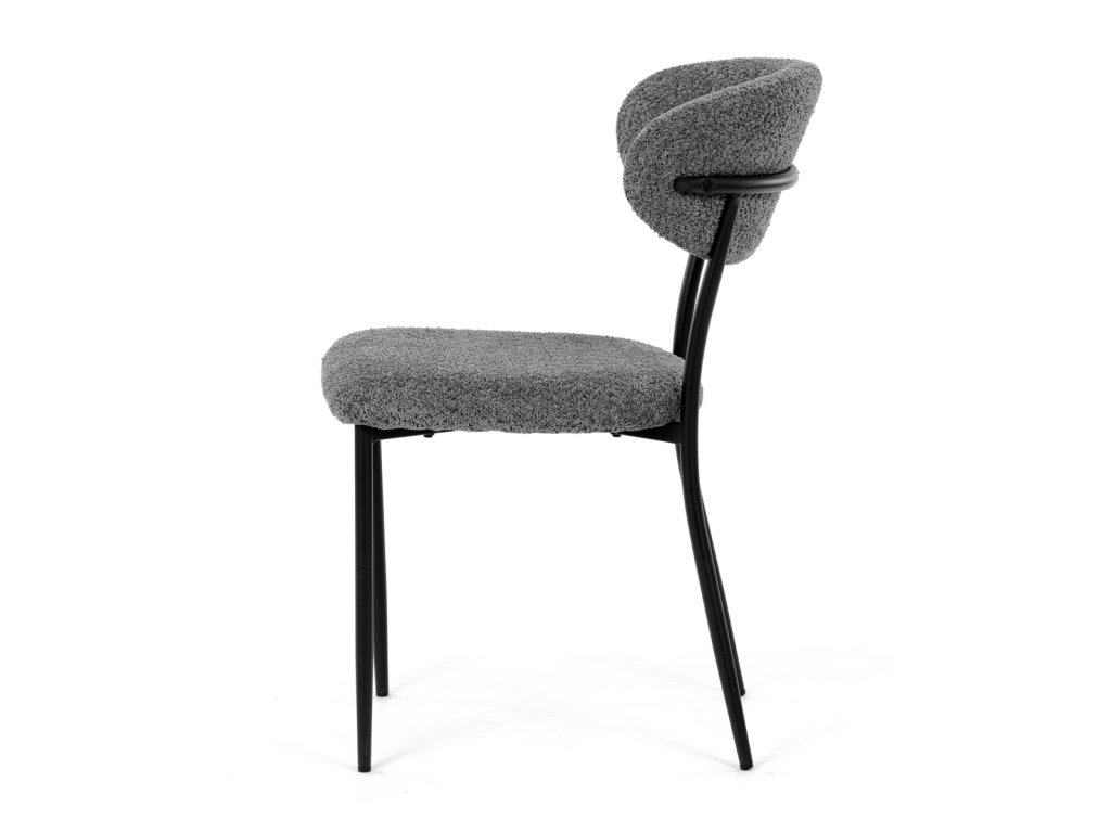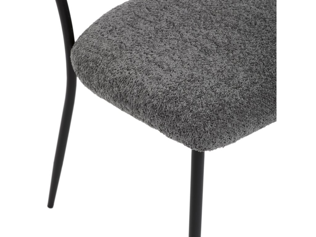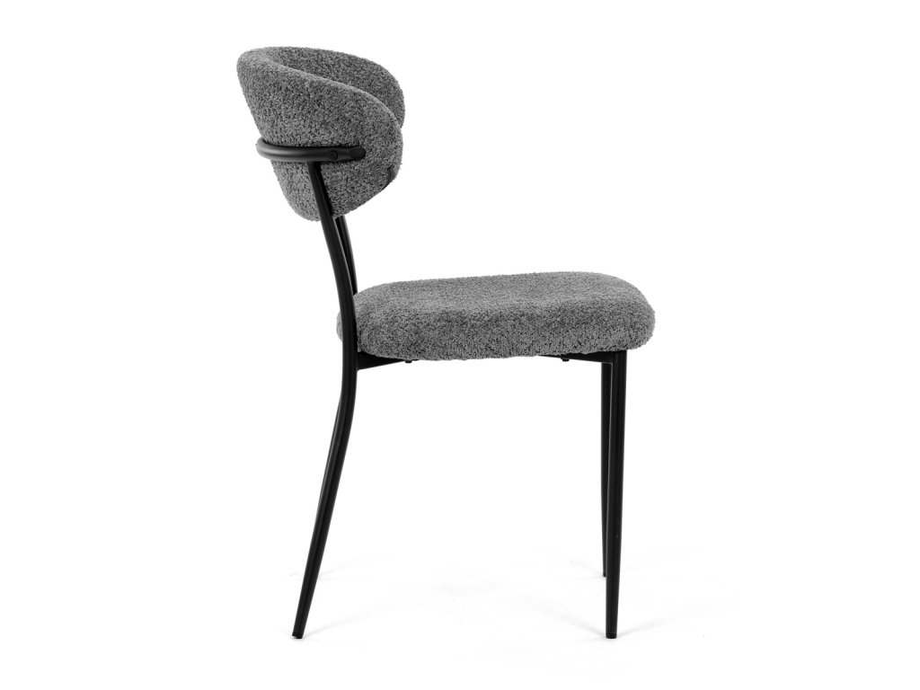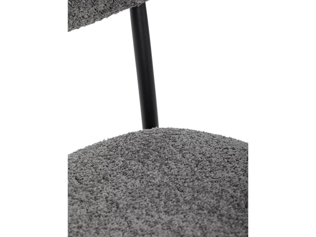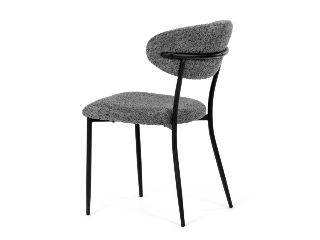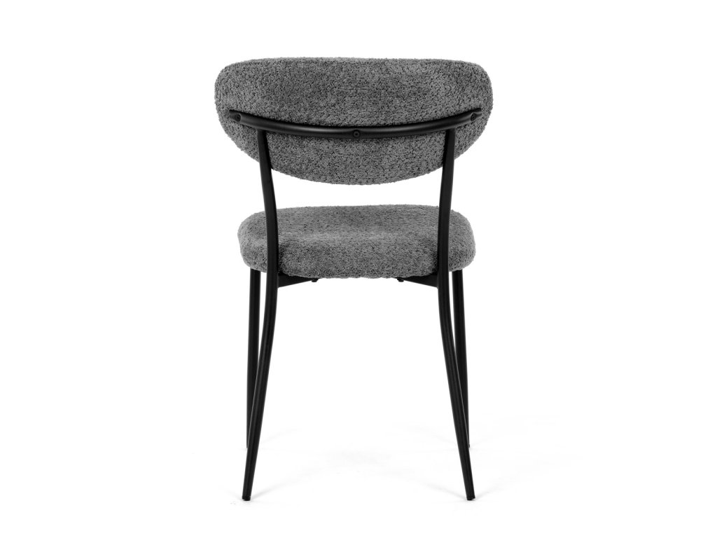 Židle má čalounění z látky Bouclé a kovové nohy s černým povrchem, což zaručuje odolnost a moderní vzhled.