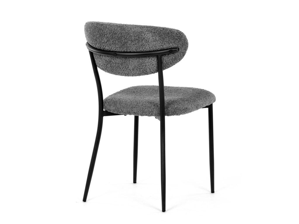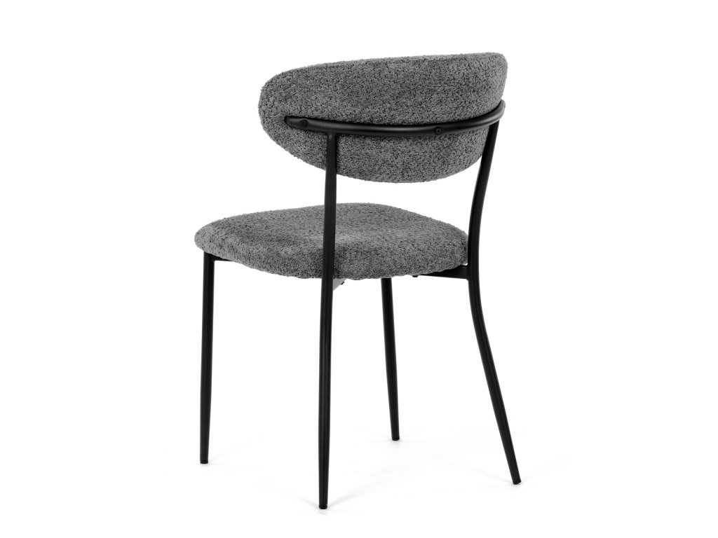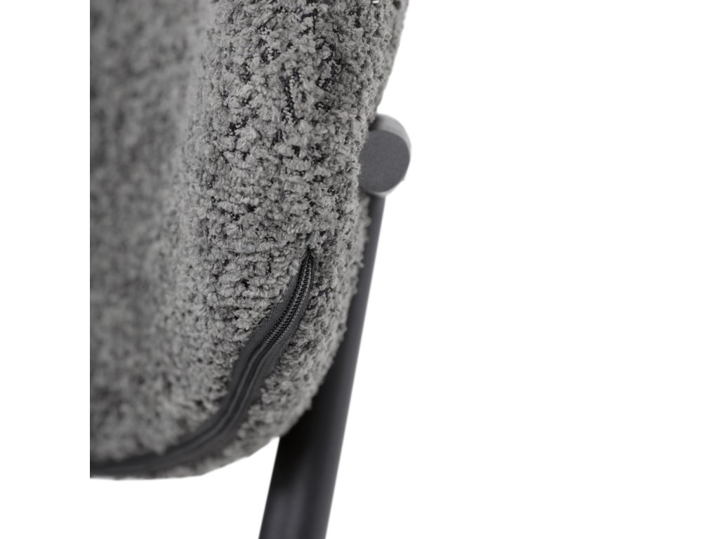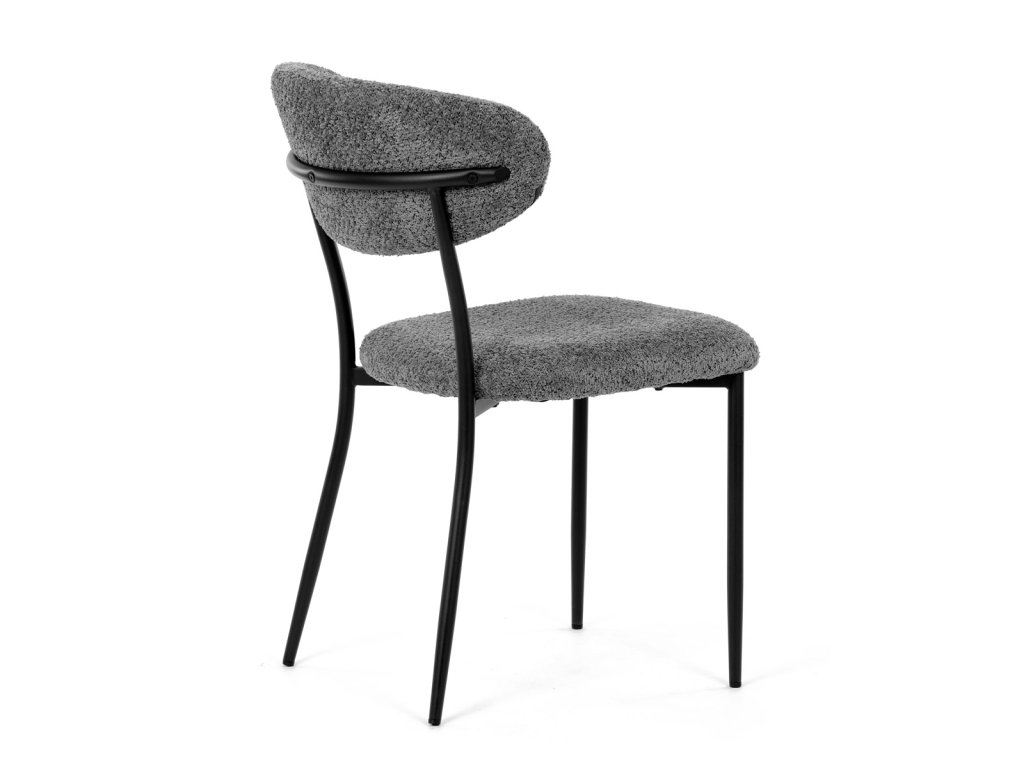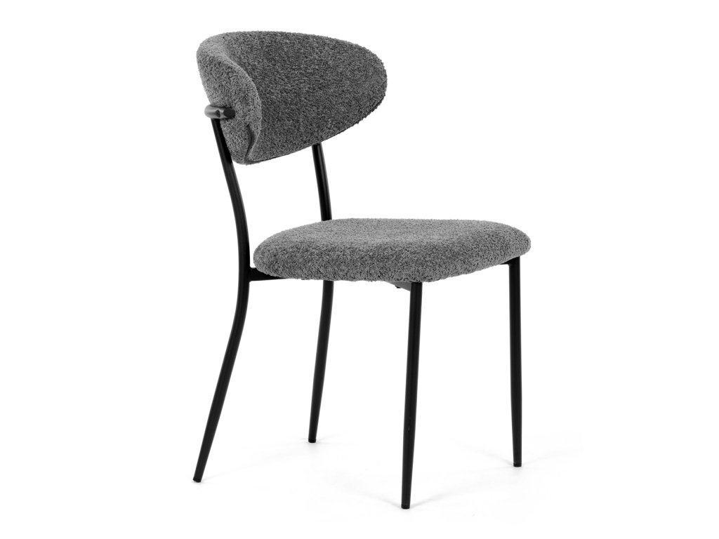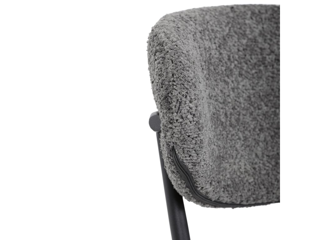 Židle má čalounění z látky Bouclé a kovové nohy s černým povrchem, což zaručuje odolnost a moderní vzhled.