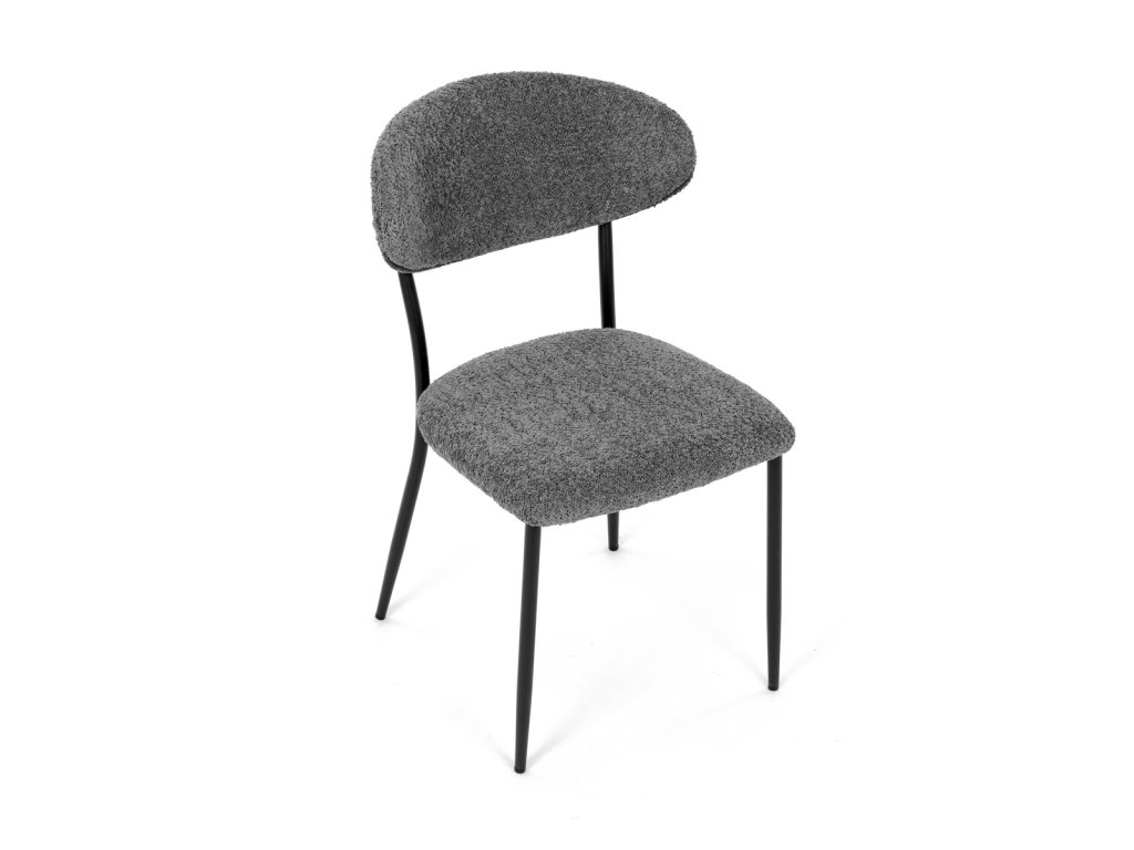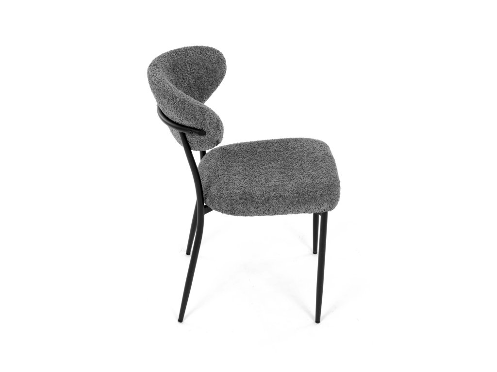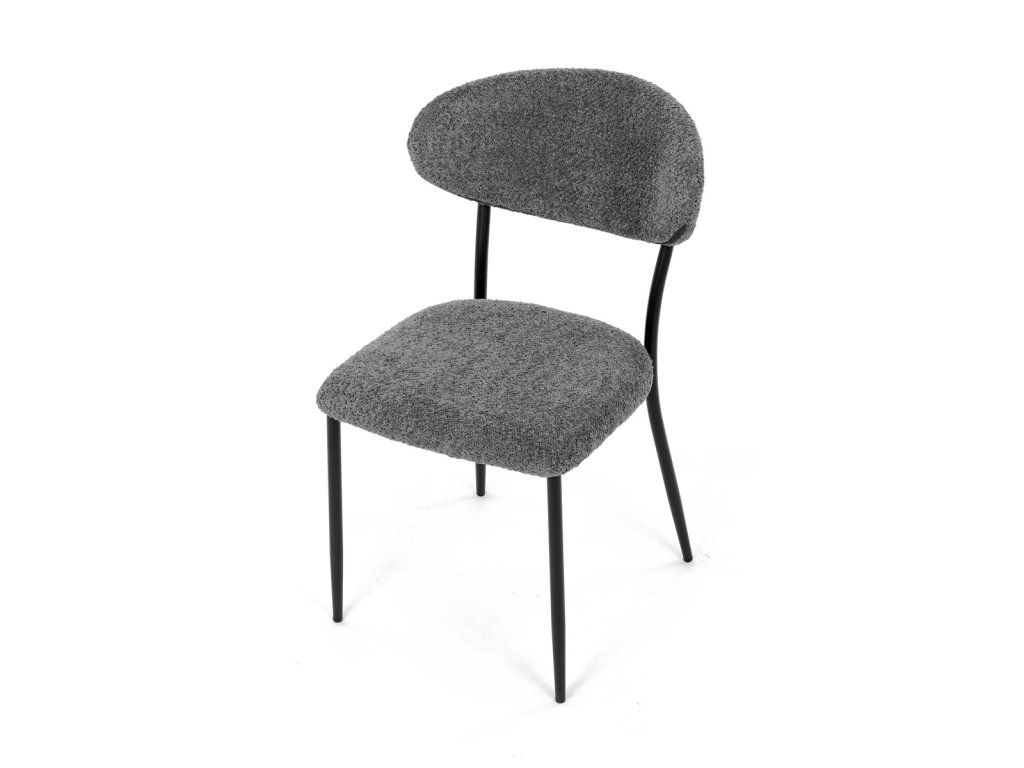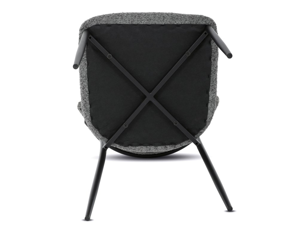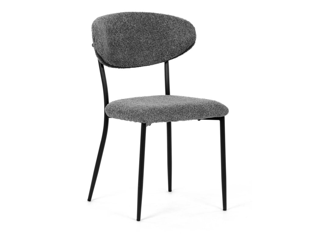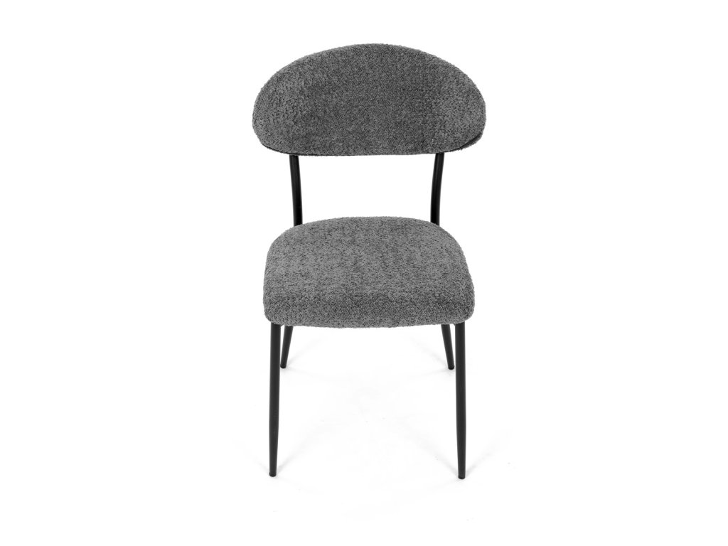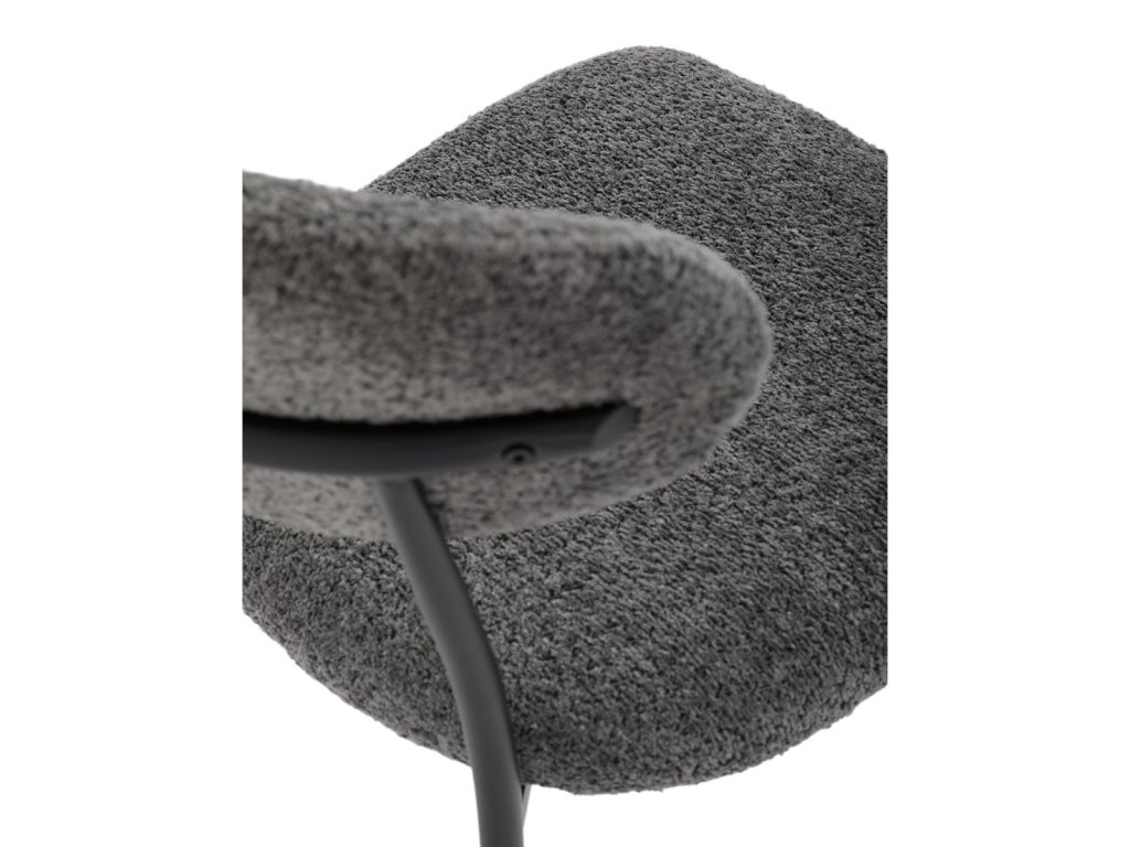 Židle má čalounění z látky Bouclé a kovové nohy s černým povrchem, což zaručuje odolnost a moderní vzhled.