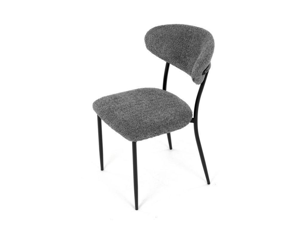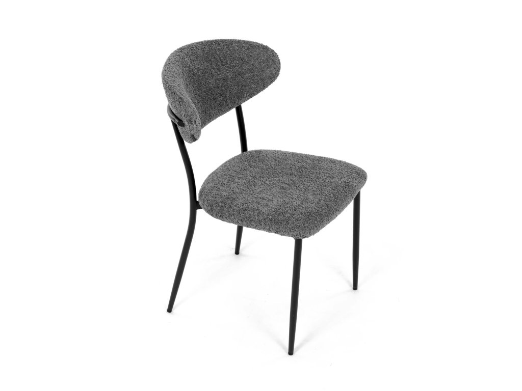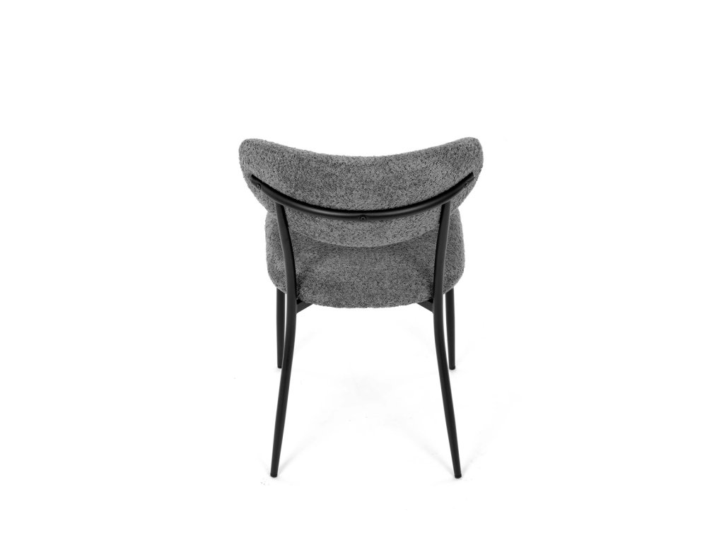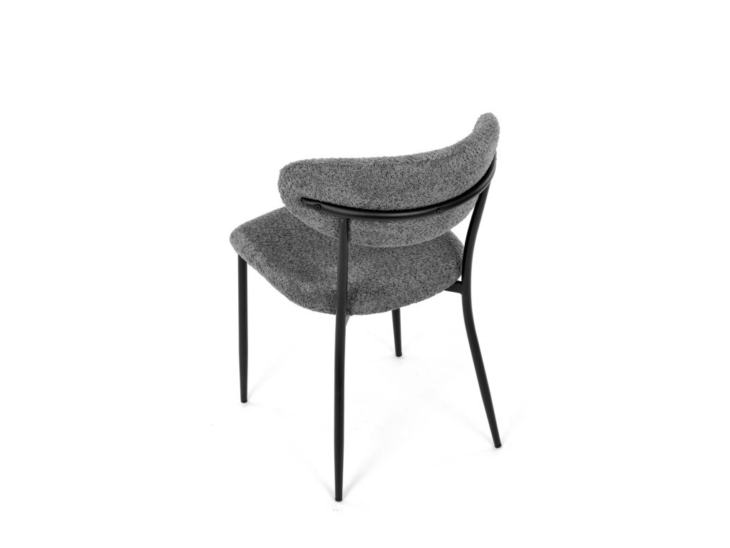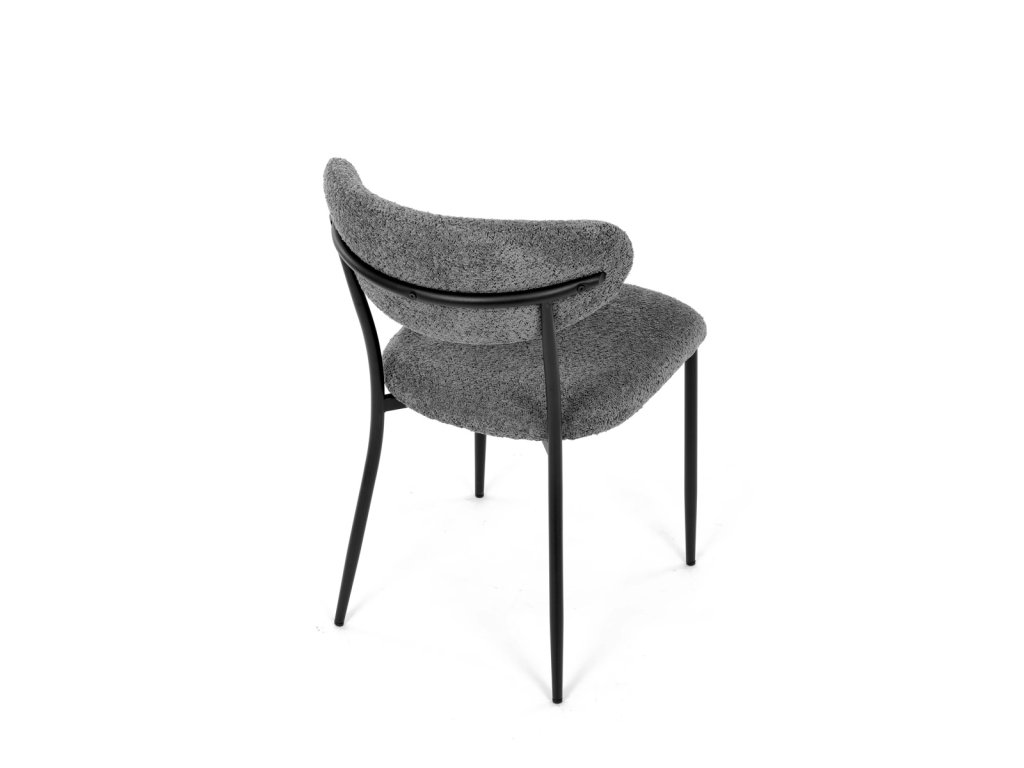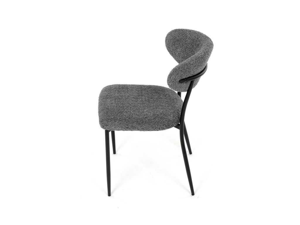 Židle má čalounění z látky Bouclé a kovové nohy s černým povrchem, což zaručuje odolnost a moderní vzhled.
