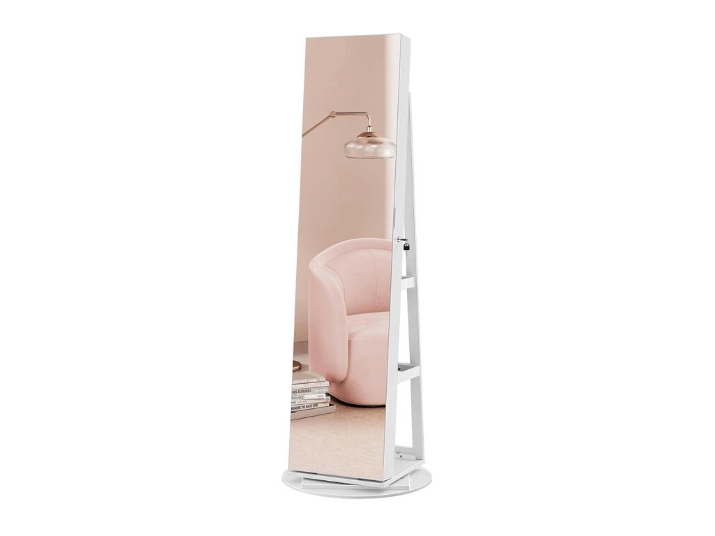 Volně stojící zrcadlo s šperkovnicí v bílém provedení je praktickým doplňkem do každé ložnice či šatny. Vyrobeno z MDF materiálu, nabízí stabilní a pevnou konstrukci s dostatečným úložným prostorem pro šperky, kosmetiku a drobné doplňky. Vnitřní část je vybavena organizéry na náušnice, náramky, náhrdelníky i prsteny, doplněnými o několik polic a kapsy pro přehledné uspořádání. Zrcadlo je otočné a stojí na pevné podstavě, která zajišťuje stabilitu. Nadčasový design v bílé barvě se snadno kombinuje s různými styly interiérů.