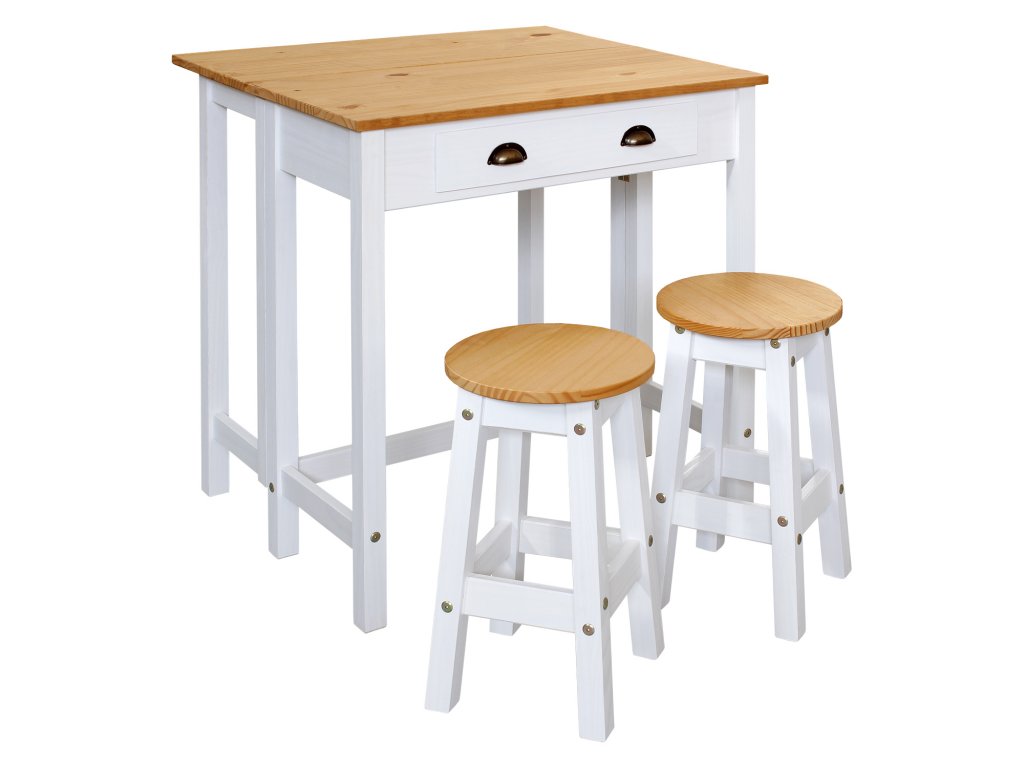 Set obsahuje stůl s zásuvkou a dvě barové židličky, které jsou vhodné pro posezení s přáteli nebo rodinné oslavy. Vhodné pro použití v interiéru i na terase.