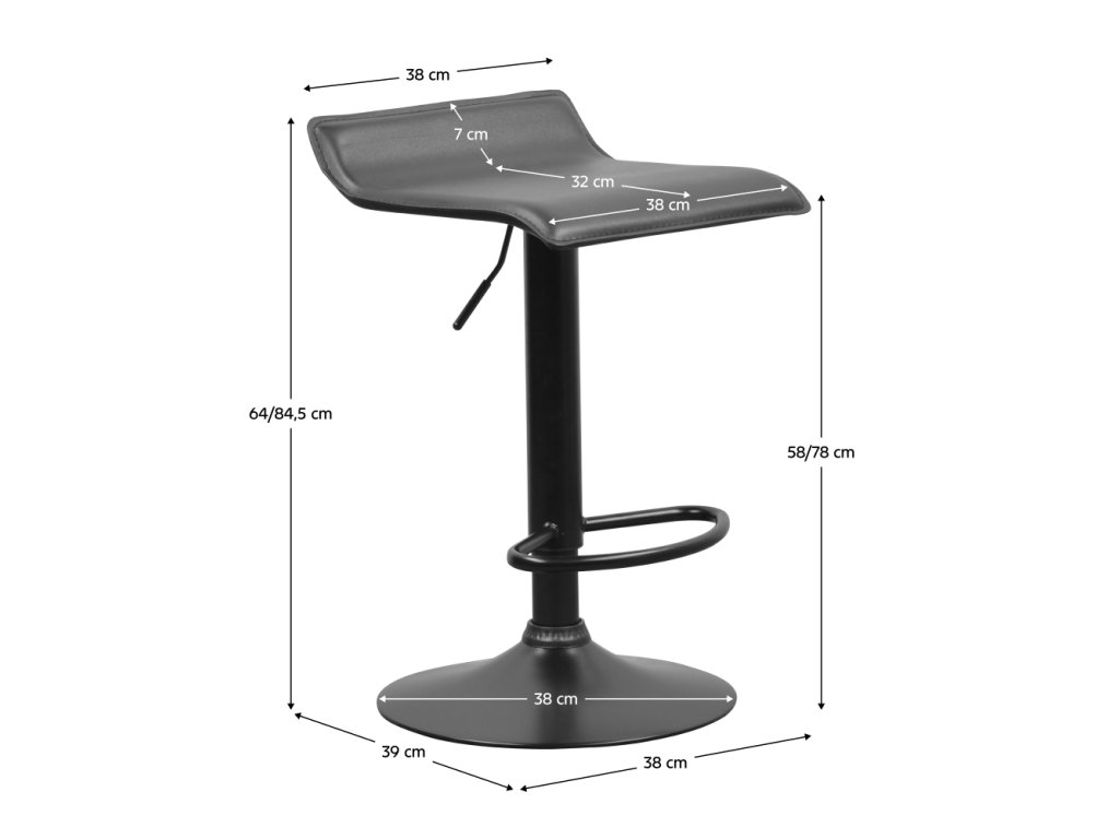 Výška sedadla je nastavitelné v rozmezí 58-78 cm, hloubka sedu 32 cm, šířka 38 cm. Průměr podstavy 38 cm zajišťuje stabilitu a bezpečnost.