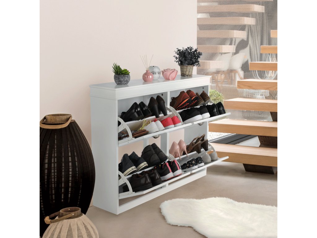 Díky dvouřadému výklopnému systému je botník vhodný pro uložení různých typů obuvi, od bot po tenisky či baleríny.