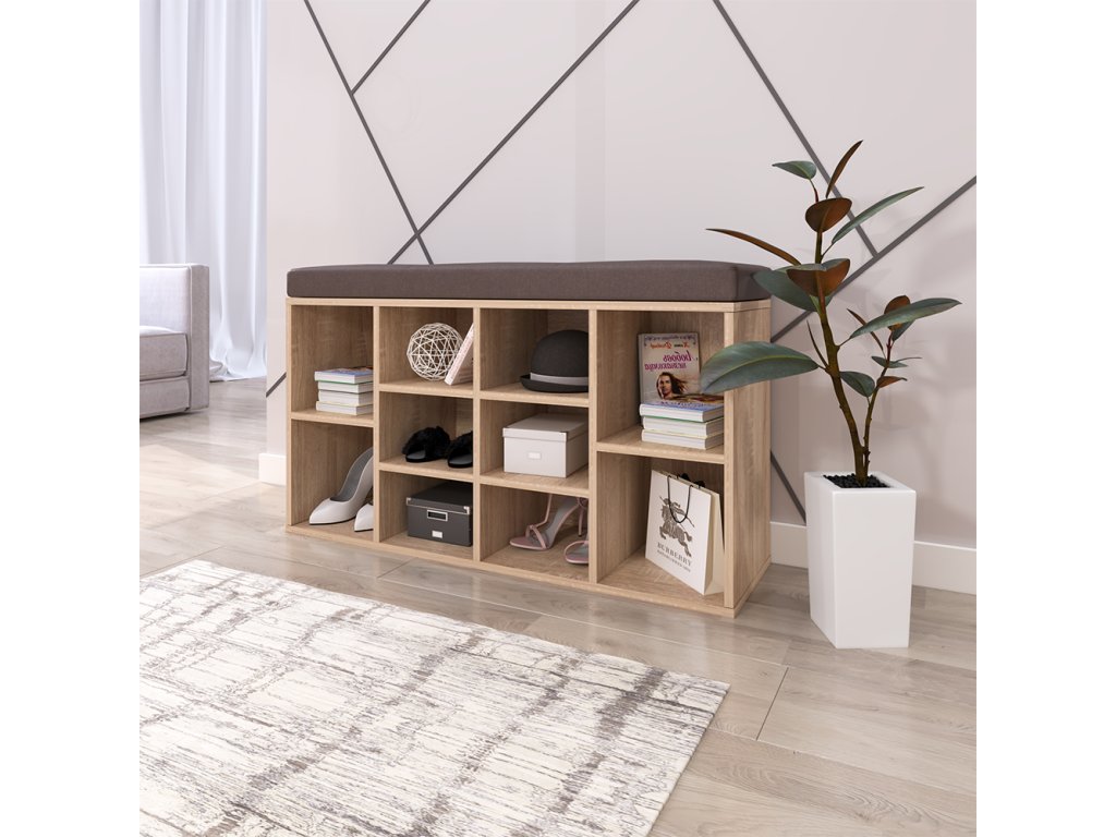 Botník FADDY v dekoru dub sonoma nabízí úložný prostor pro obuv a zároveň pohodlné sezení díky polstrované lavici. Ideální do předsíně pro rychlé obouvání a uskladnění bot.