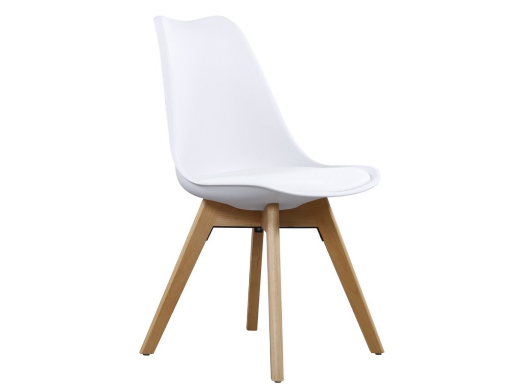 Elegantní čalouněná židle s ergonomickým tvarem. Zajímavě řešená dřevěná konstrukce je v barvě buk, sedák s opěradlem jsou z kvalitního pevného PP plastu ( polypropylen + polyuretan ). Sedák navíc obsahuje polštářek z ekokůže. Barevné provedení - bílá. Nohy židle mají zpevňující kovový kříž, který podstatně přispívá ke stabilitě a odolnosti židle.Doplňkové parametry