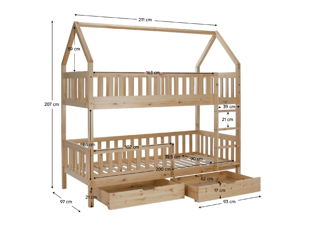 Vyrobena z borového dřeva a překližky v přírodním provedení, rozměry 211x97x207 cm. Plocha na spaní 90x200 cm, dodávána bez matrace, s překližkovými rošty.