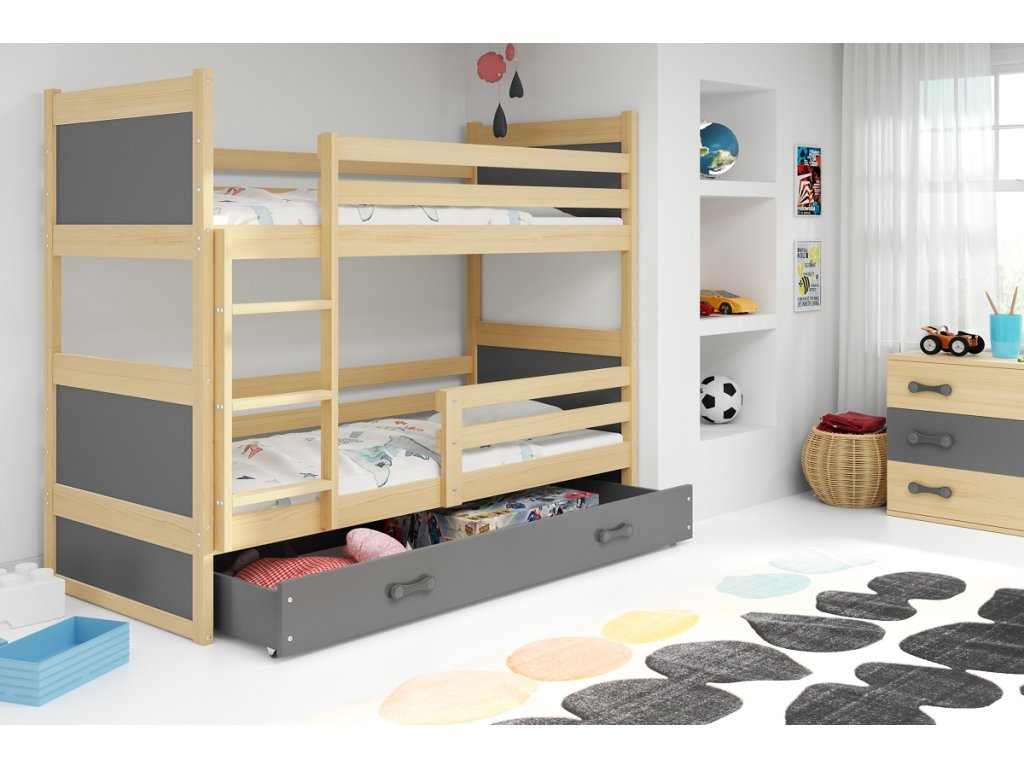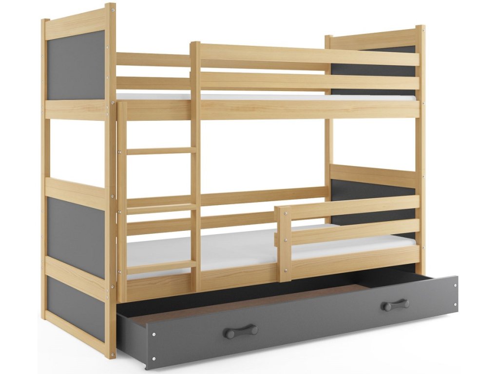 Dětská patrová postel Riky je určena pro ty, kteří pro své dítě hledají funkčnost, moderní design a kvalitu. Postel je vyrobena z borovicového dřeva v kombinaci s MDF deskou (barevné panely na bocích postele). Její stabilní konstrukce, zaoblené hrany a zábrana na horní i dolní posteli, zajišťují bezpečnost a pohodlí dítěte. Žebřík si můžete podle potřeby umístit na pravou, nebo levou stranu postele. Když děti patrová postel omrzí, je možno palandu rozložit na dvě samostatné postele. Součástí postele je 2x zábrana, praktický úložný prostor na kolečkách, 2x rošt a 2x pěnová matrace s doporučenou nosností do 70 kg. Tloušťka matrace je 7cm. Plocha pro spaní je 2x 90x200 cm. Postel je dodávána v demontu a součástí je montážní plánek včetně všech potřebných spojovacích materiálů. Vyobrazené dekorace nejsou v ceně.