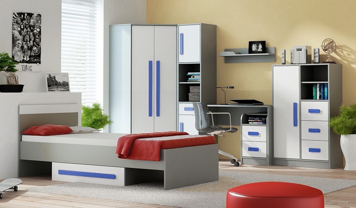 Sestava do dětského pokoje ze sektorové řady, která se vyznačuje netradičním zpracováním barev a originalitou úchytů. Tento styl nábytku zaujme každou mladší generaci. Nábytek je vyroben z kvalitní LTD desky hraněné ABS lištou. Korpus je v barvě šedá antracit, dveře jsou bílé matné. Úchytky jsou ve 4 barevných kombinacích.