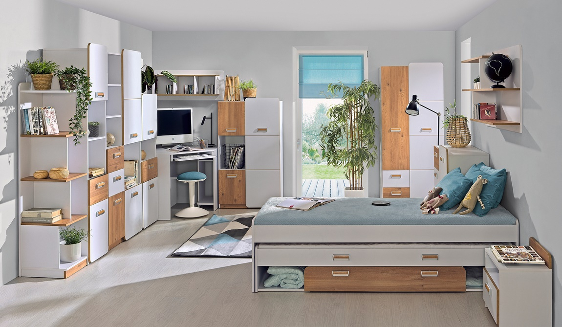 Sestava do dětského pokoje. Nábytek je vyrobený z kvalitní laminátové desky v barevném provedení bílá briliant, přední dvířka mají barevnou dekoraci - dub nash. Dekorace je vytvořena z ABS pásky z PVC výrazné barvy