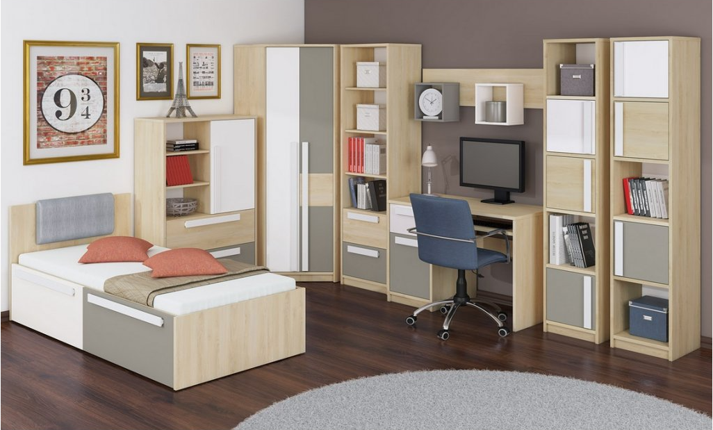 Sestava do dětského pokoje v moderním provedení. Korpus je vyroben z kvalitní desky LTD hraněné ABS páskou v barvě buk fjord, dvířka jsou vyrobeny z desky LTD v kombinaci barev buk fjord/bílá/šedá.