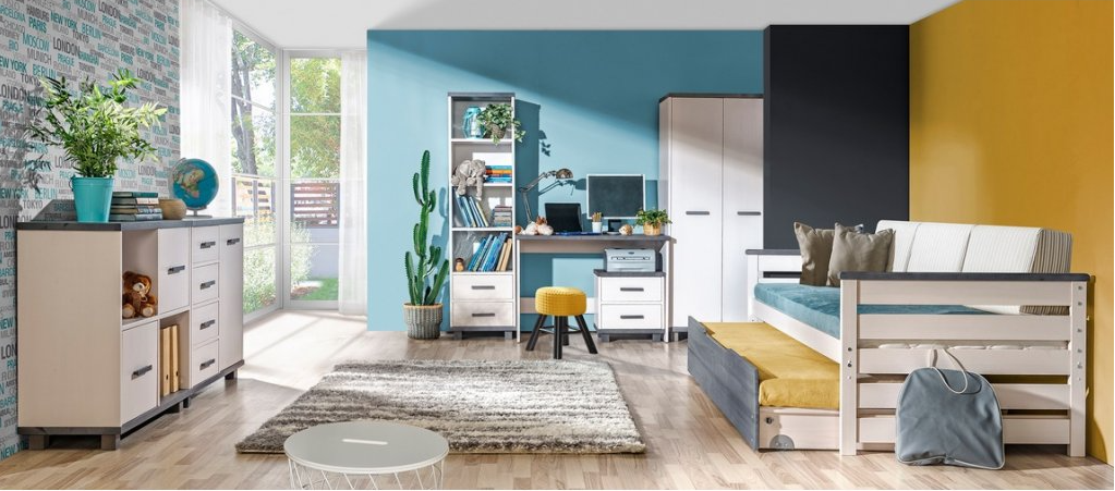 Sestava do dětského pokoje z borovicového masívu, v barevném provedení moření korpusu bílou barvou a doplňkovou barvou je popelavá