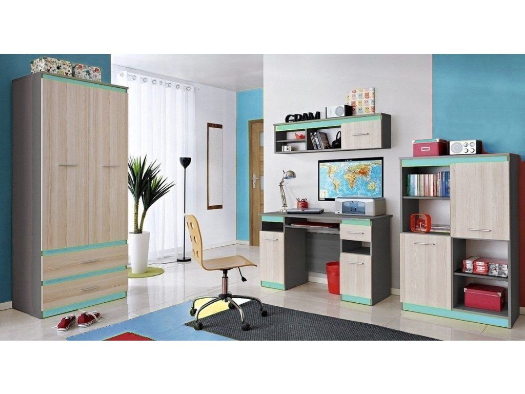 Praktický nábytek do dětského pokoje vhodný jak pro holky, tak i kluky. Barvy jsou neutrální, jedná se o jasan coimbra v kombinaci se světle modrou (viz. foto). Korpus je v barvě grafit. Nábytek je vyroben z kvalitního lamina ( korpus 16 mm, dvířka 18 mm ). Tato dětská sestava se skládá ze 4 dílů ( š/h/v ) - šatní skříň 80 x 52 x 200 cm, PC stolek 120 x 50 x 75 cm, kombinovaná police 120 x 22 x 34 cm a kombinovaný regál 80 x 43 x 128 cm. Sestavu lze koupit pouze celou, jednotlivé díly nelze koupit zvlášť. Dodáváme v demontovaném stavu.Doplňkové parametry