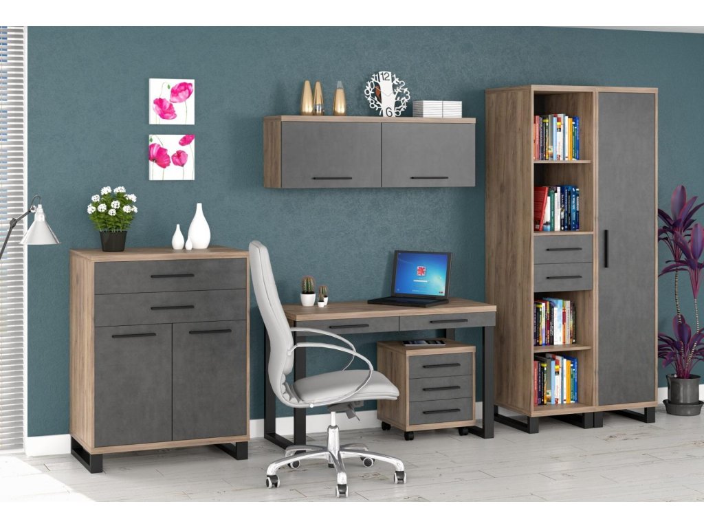 Součástí sestavy jsou skříně, psací stůl, kontejner, regál a další prvky, které umožňují efektivní uspořádání prostoru. Kovové nohy a úchyty dodávají loftový vzhled.