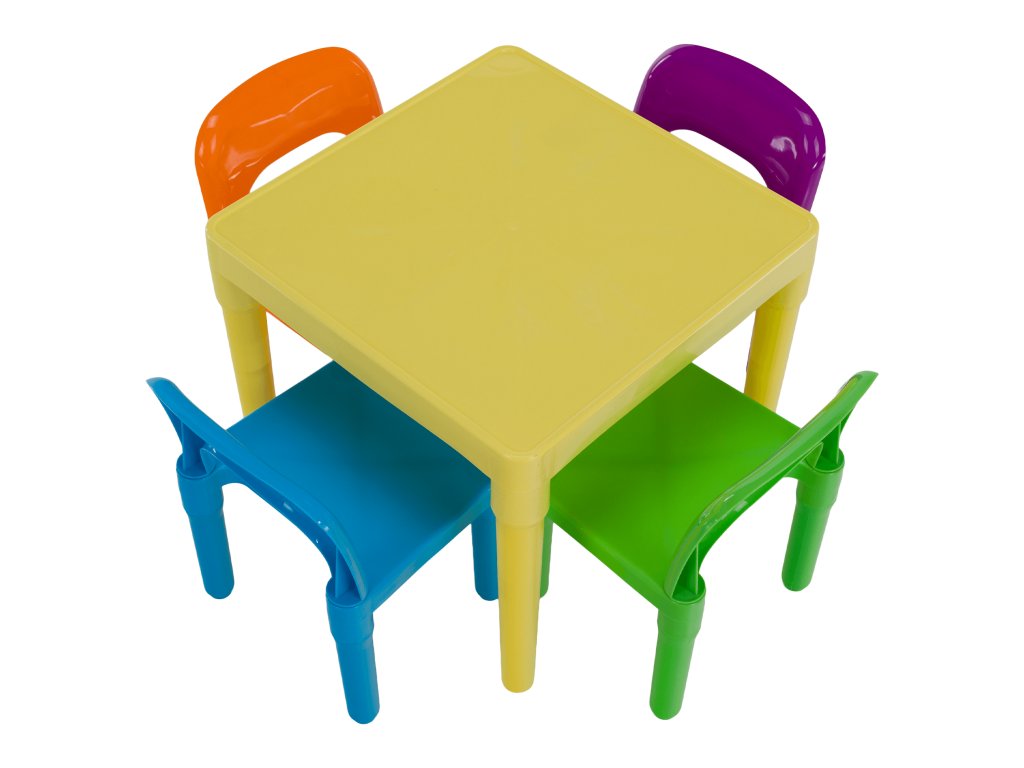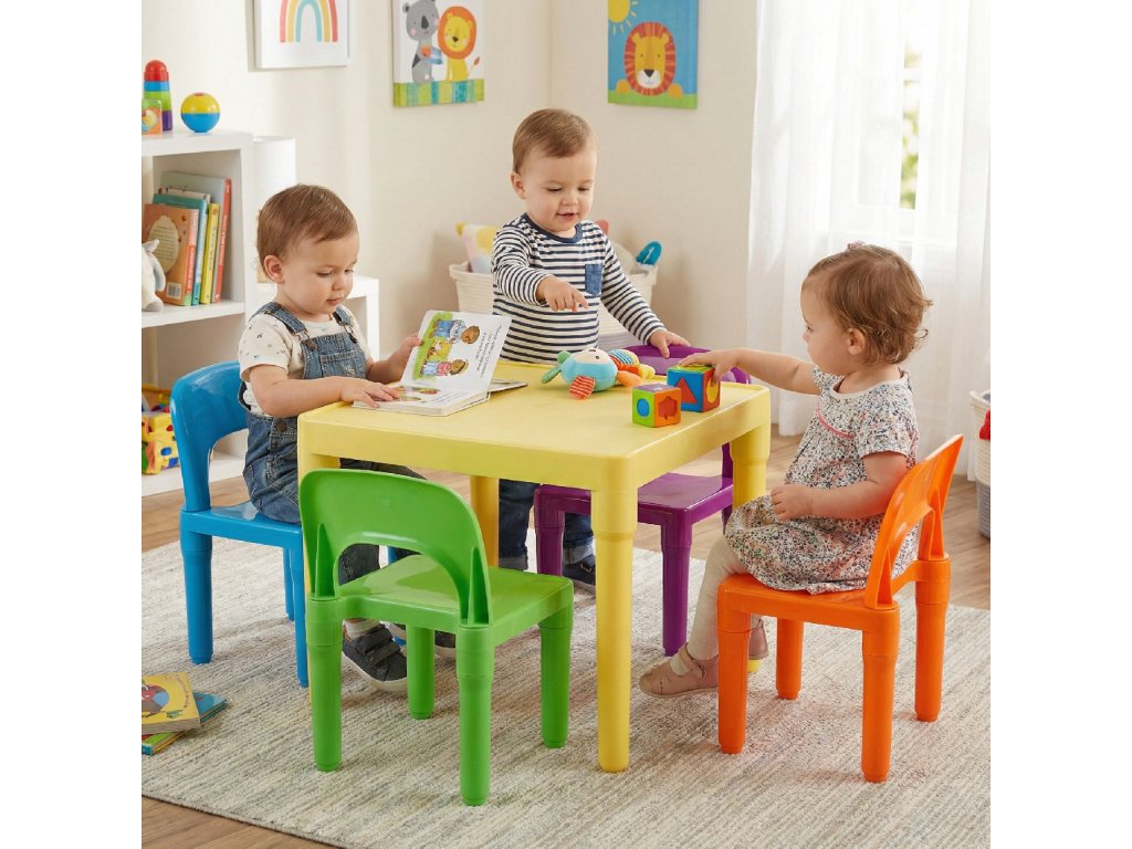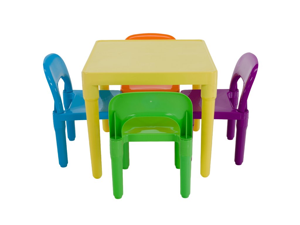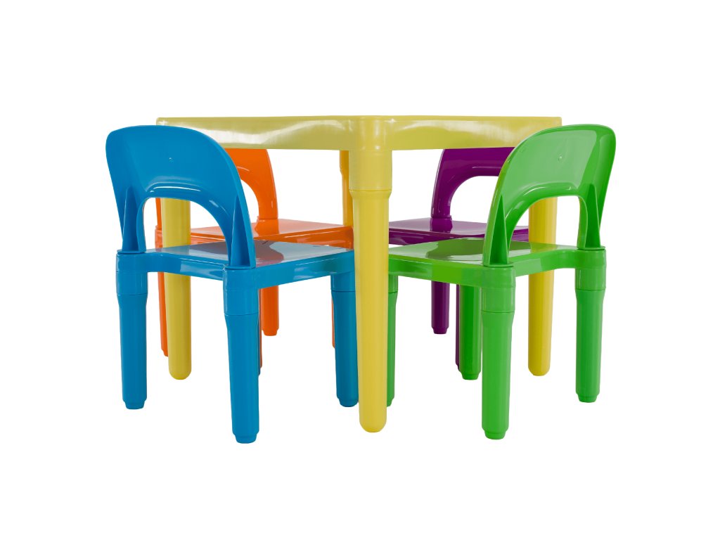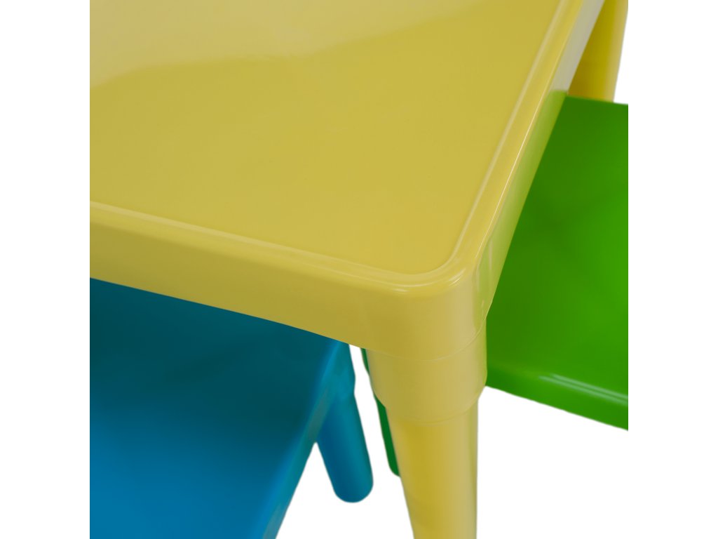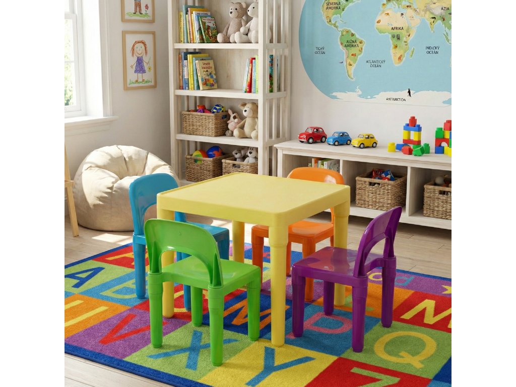 Set obsahuje stůl a dvě židle v vícebarevném provedení, vhodný pro hraní, kreslení nebo učení. Ideální do dětského pokoje pro aktivní i odpočinkové chvíle.
