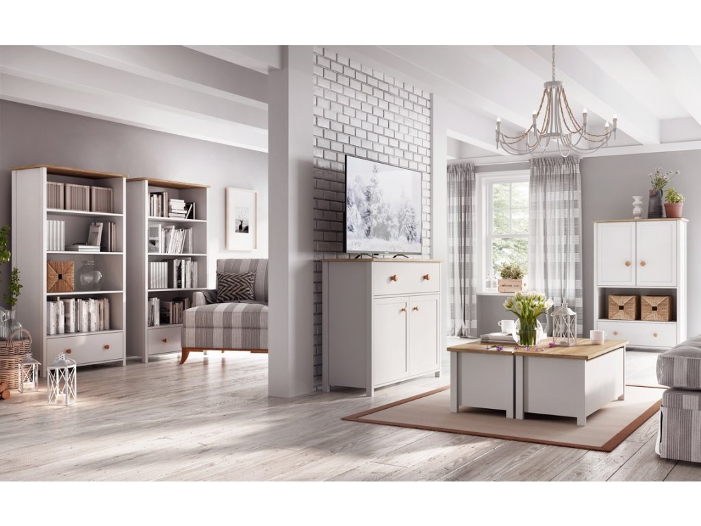 Knihovna TOJAVA 02 nabízí otevřené police pro knihy a dekorace a prostornou zásuvku ve spodní části pro uložení hraček nebo školních potřeb.