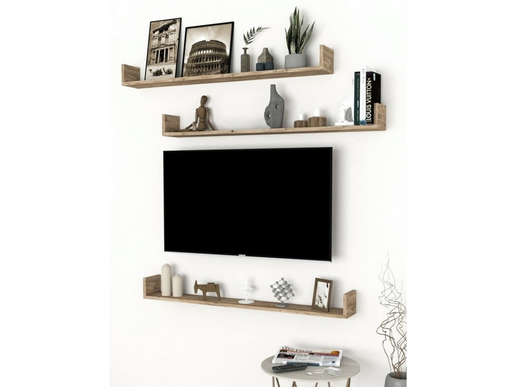 Sada tří závěsných polic v dekoru borovice je ideální pro obývák nebo kuchyni. Snadná instalace a variabilní využití pro dekorace, knihy nebo drobnosti.