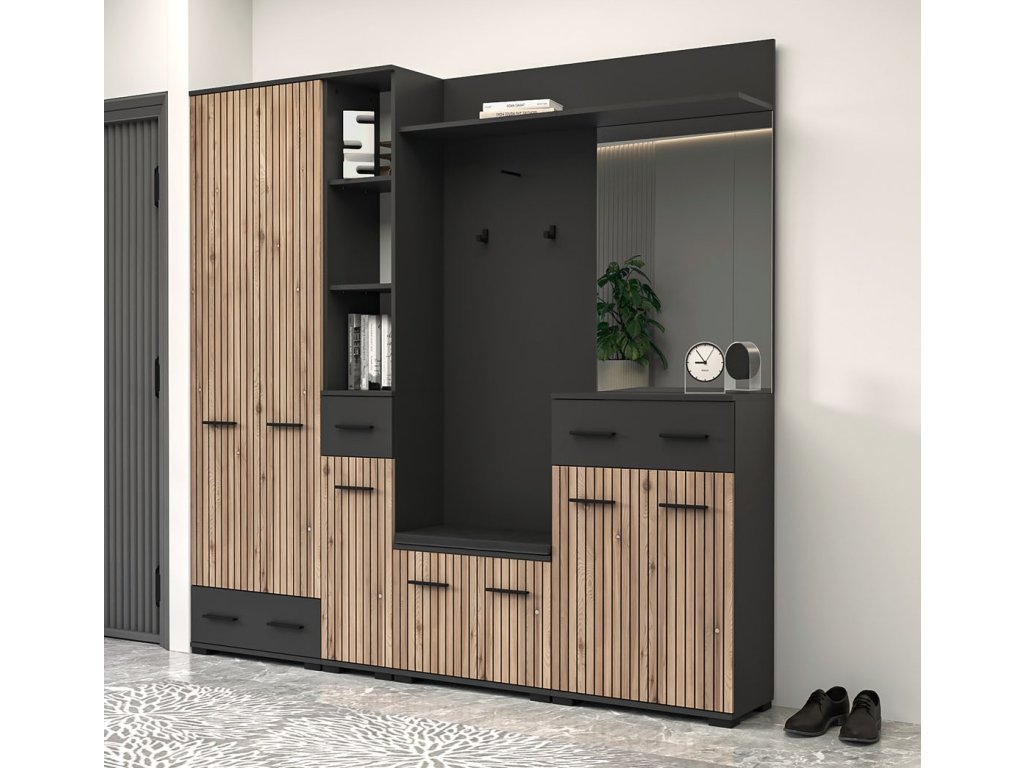 O stylový design Vaší vstupní části se postará moderní předsíňová sestava . Kombinace moderních barev a předních dvířek imitujících trendové lamely jí dodává jedinečný charakter.