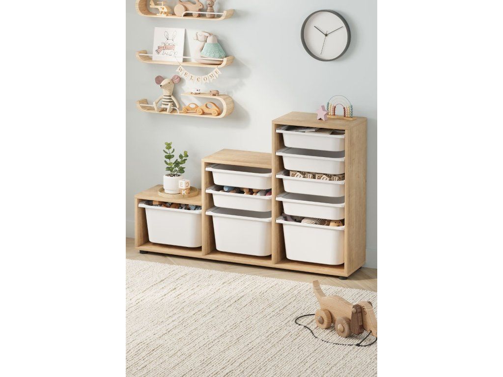 Úložný box na hračky přináší praktický a stylový způsob, jak udržet dětský pokoj uklizený. Díky třem různým výškám a více plastovým boxům nabízí dostatek úložného prostoru pro všechny hračky, knížky či školní potřeby.