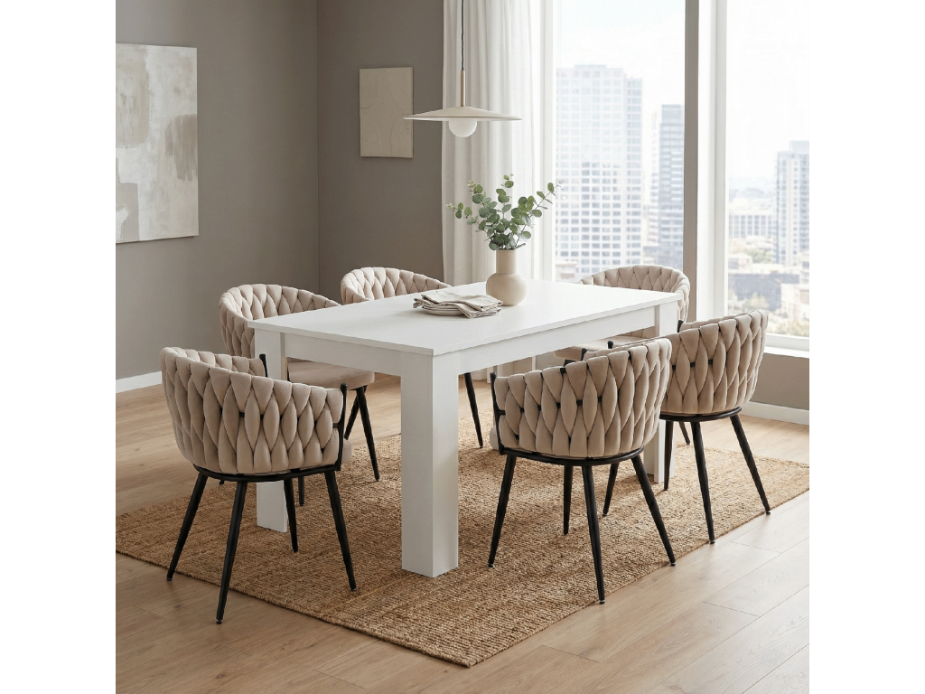 Bílá barva a moderní vzhled se hodí do jídelny, kuchyně i otevřených prostor. Ideální volba pro funkční a esteticky příjemné prostředí.
