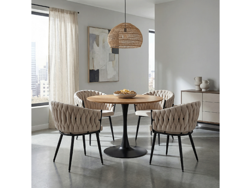 Stůl je vyroben z foliované MDF a kovové podstavby, což zaručuje dlouhou životnost a stabilitu. Průměr 110 cm poskytuje dostatek prostoru pro 4–6 osob.