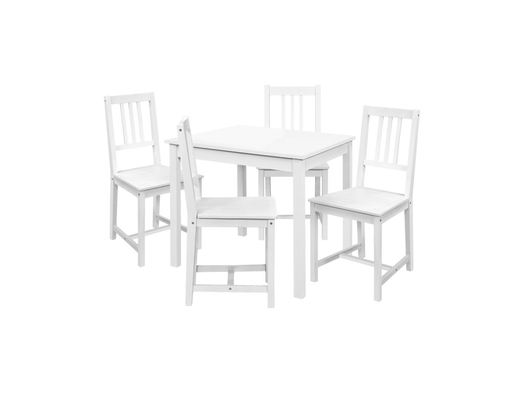 Jídelní stůl 8842B a 4 židle 869B jsou vyrobeny z masivní borovice s bílým lakem. Díky kvalitnímu materiálu jsou odolné a vhodné pro každodenní použití v domácnosti.