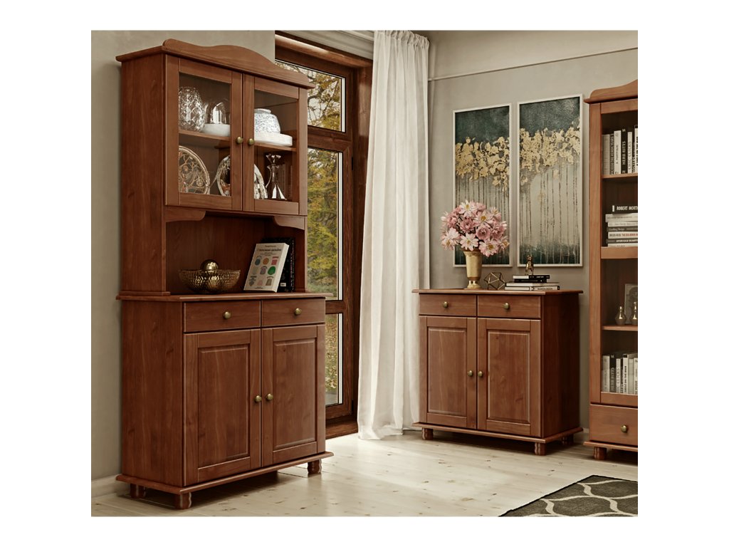 Příborník RUBI nabízí 2 dveře, 2 zásuvky a polici, ideální pro uspořádání jídelny nebo obývacího prostoru. Vyroben z masivu borovice s tmavě hnědým lakem, odolný a snadno udržovatelný.