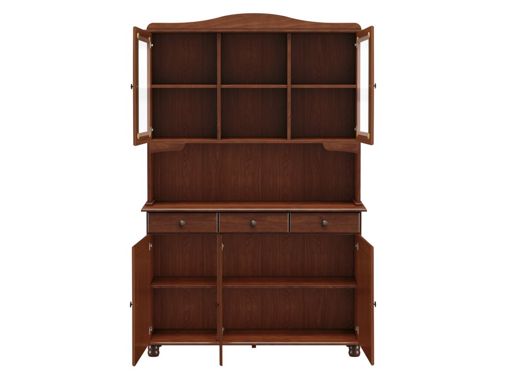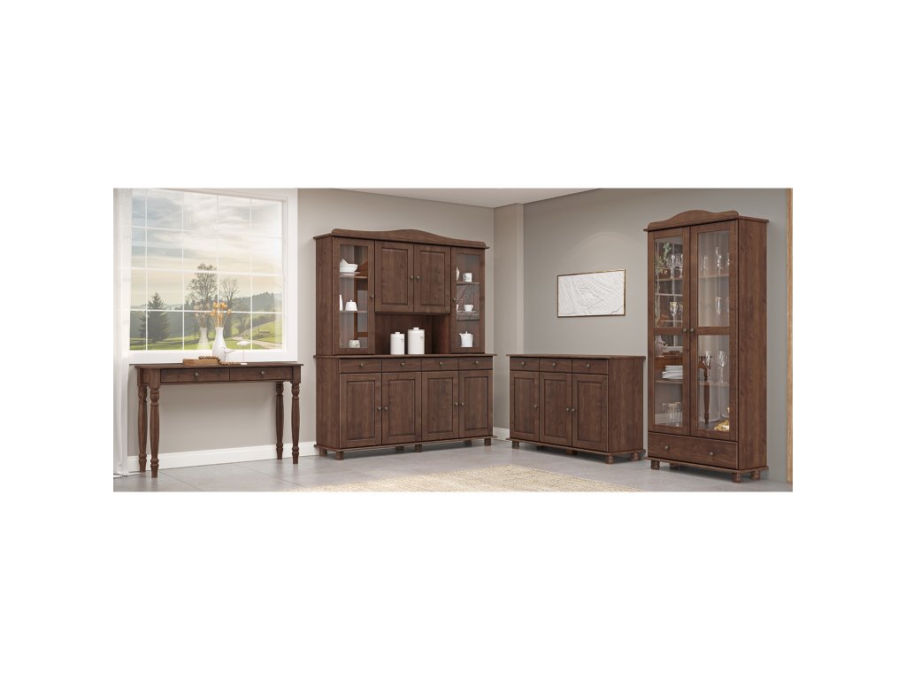 Má tři dveře a tři zásuvky v dolní části a dvě prosklené dveře v horní části, což poskytuje dostatek místa pro uskladnění jídelního nádobí, příborů i dekorací.