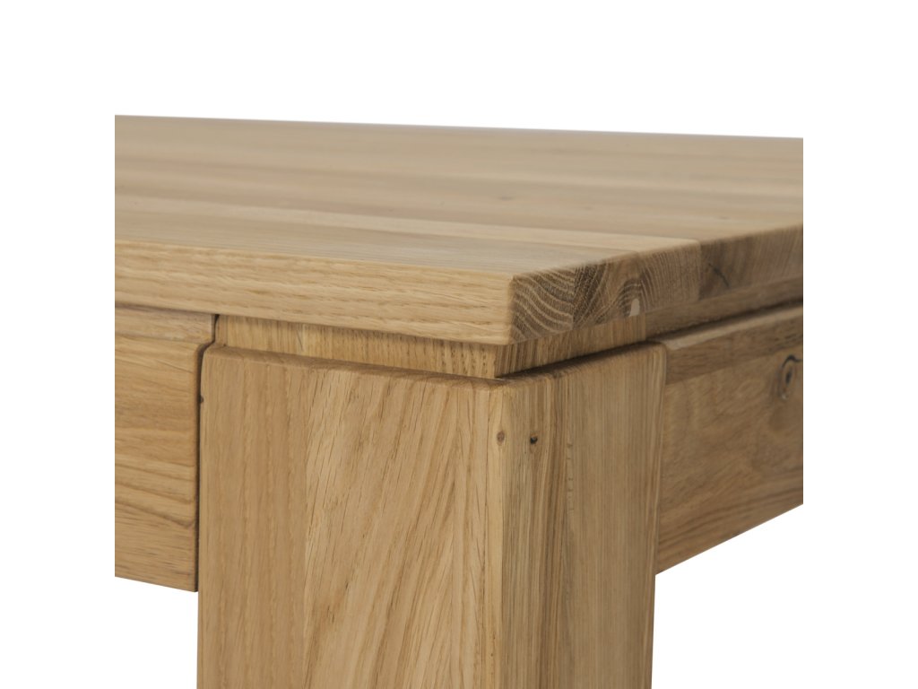 Pevné nohy z masivu zajišťují dlouhou životnost a stabilitu stolu. Deska je odolná vůči poškrábání a skvrnám díky povrchové úpravě olejem.