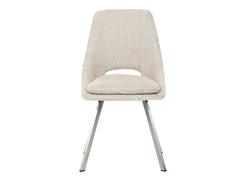 Krémová látka a kovové nohy s broušenou nerezovou úpravou zajišťují moderní vzhled a stabilitu. Ideální do jídelny nebo moderního prostoru, nabízí komfort a dlouhou životnost.
