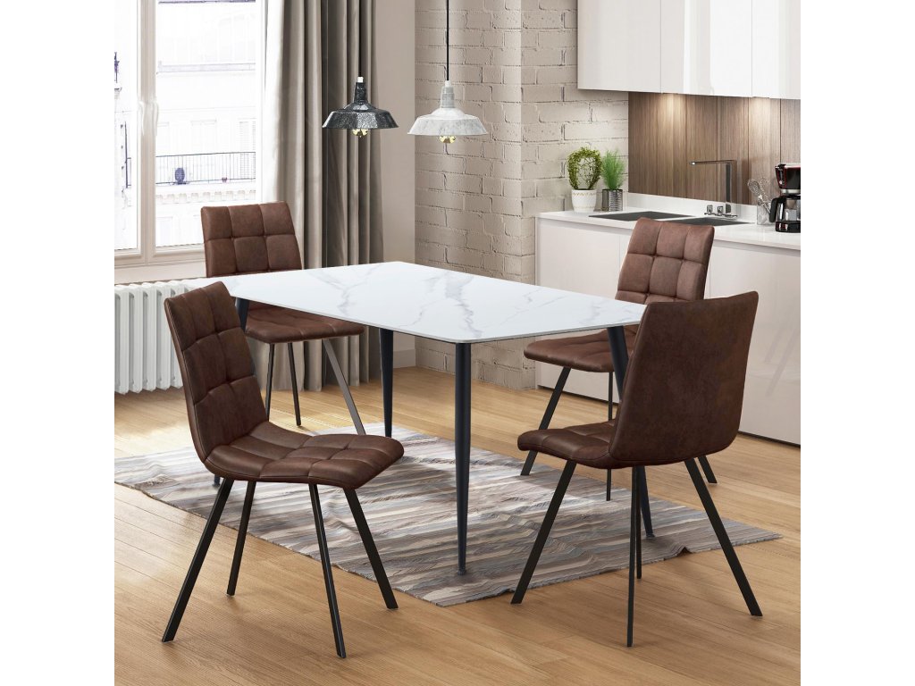 Set obsahuje jídelní stůl ADRIA 130x70 a čtyři židle BERGEN v hnědé mikrovlákno. Ideální pro každodenní použití v domácnosti či menších prostorách.