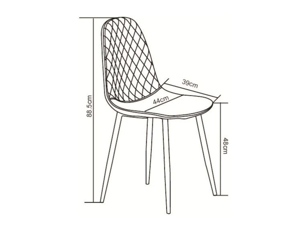 Židle má šířku 44 cm, hloubku 50 cm a výšku 89 cm, což je ideální pro většinu jídelních stolů.