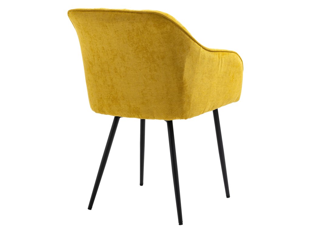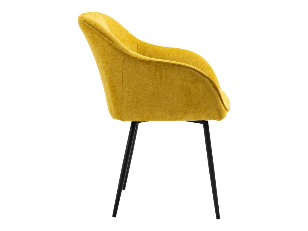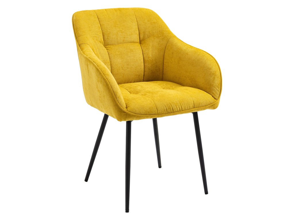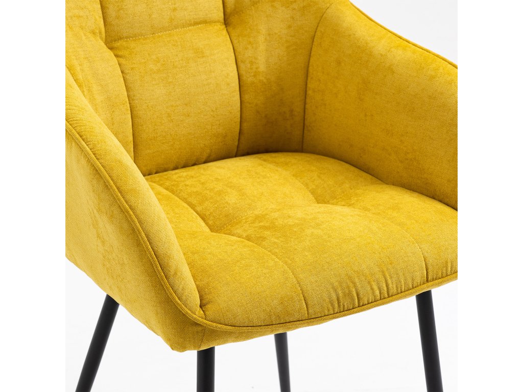 Židle má textilní potah v žluté barvě a kovovou konstrukci, která zajišťuje stabilitu a odolnost. Výška sedu je 48 cm, což je standardní výška pro pohodlné sezení u jídelního stolu.