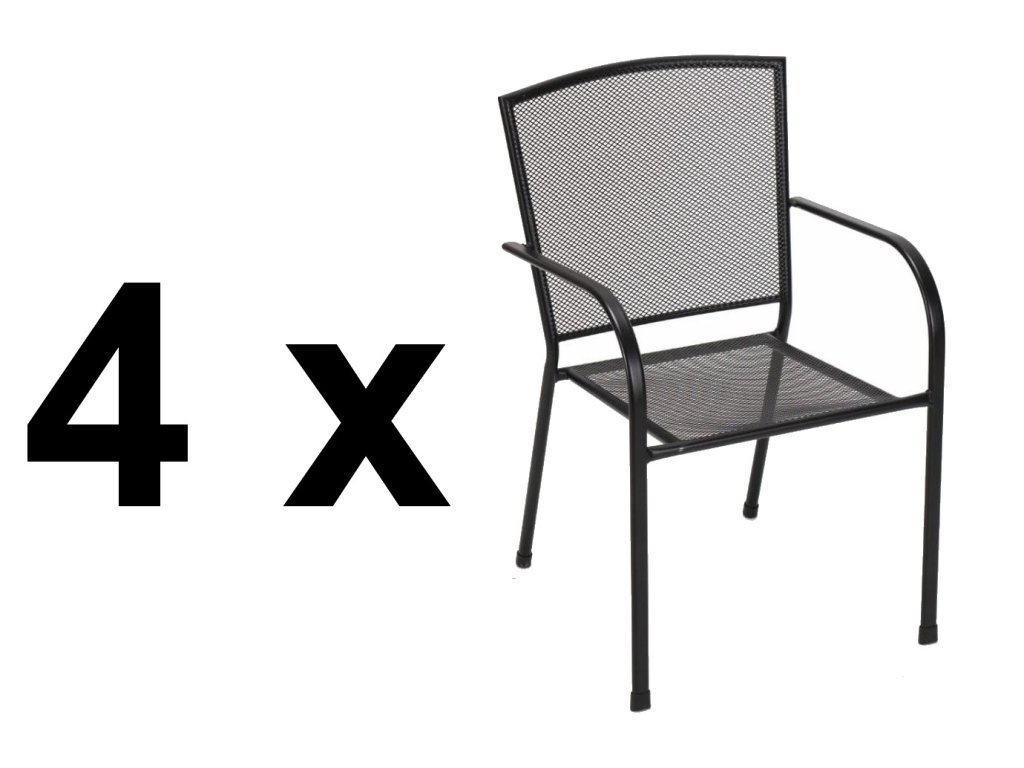 Set 4 ks židlí za zvýhodněnou cenu!Výjimečná zahradní židle, která se stane ozdobou Vašeho exteriéru. Tato zahradní židle vytvoří nejen stylový dekorační prvek, který vynikne na každém místě, ale také prostor pro chvíle odpočinku a relaxace. Oceníte područky i možnost skladování, díky čemuž ušetříte místo v období, kdy nábytek nebudete využívat. Zahradní židle je vyrobena z kovu a má černou barvu.